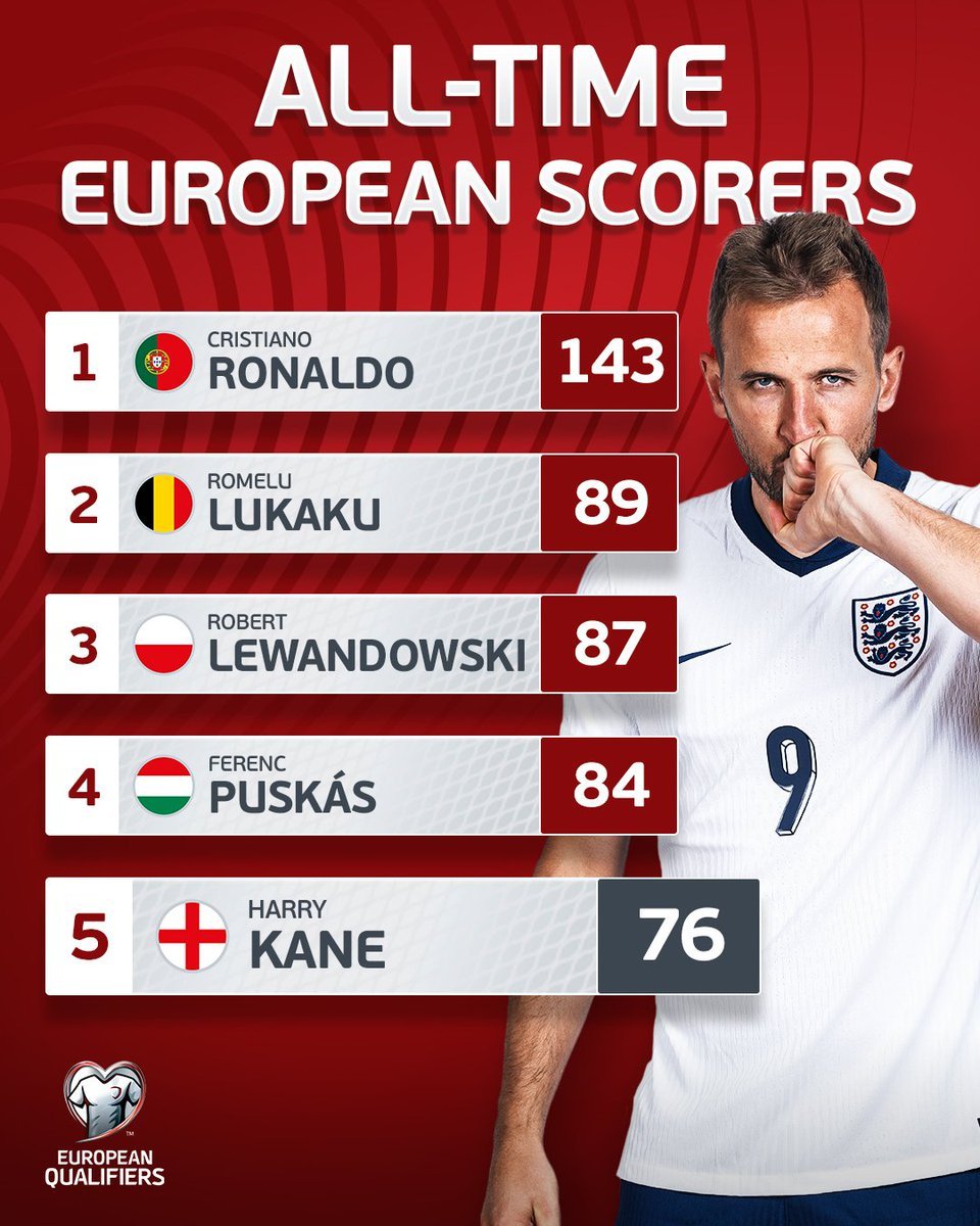 哈里·凯恩跻身欧洲国家队历史射手榜前五名