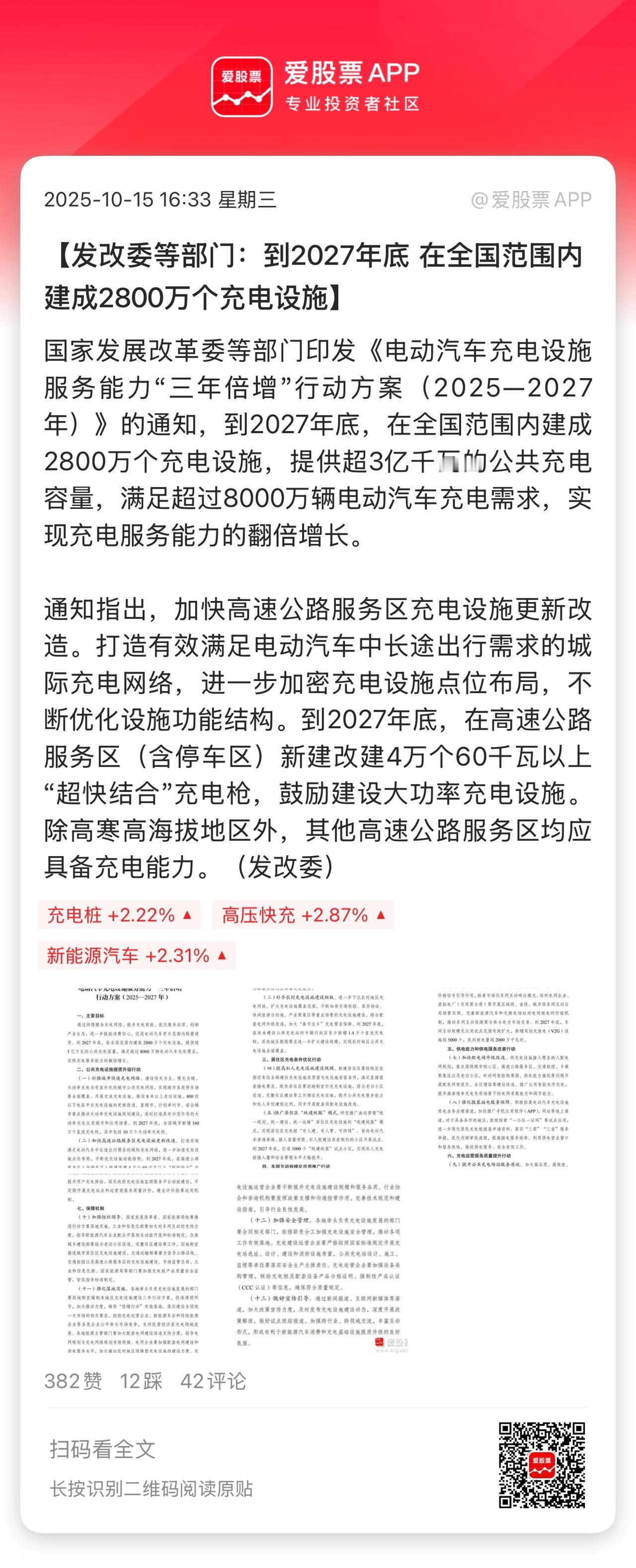 6部门放大招,未来2年要新建2800万个充电设施,以后电动车就没有充电焦虑了!尤其假期高速等特殊场景,肯定都是未来建设的重点。 这个利好整个充电桩产业链,包括直流快充、交流慢充设备商以及电力运营商等,会带来很多新的订单。对下游新能源车尤其是纯电动汽车厂商是利好。今晚蔚小理在美股集体高开,不过都是高开回落! 都说AI的尽头是电力,其实新能源车的尽头也是电力。我们要建设如此多的充电设施,全球看只有中国才有这种变态强的电网能力了,这会强化我们新能源的优势。