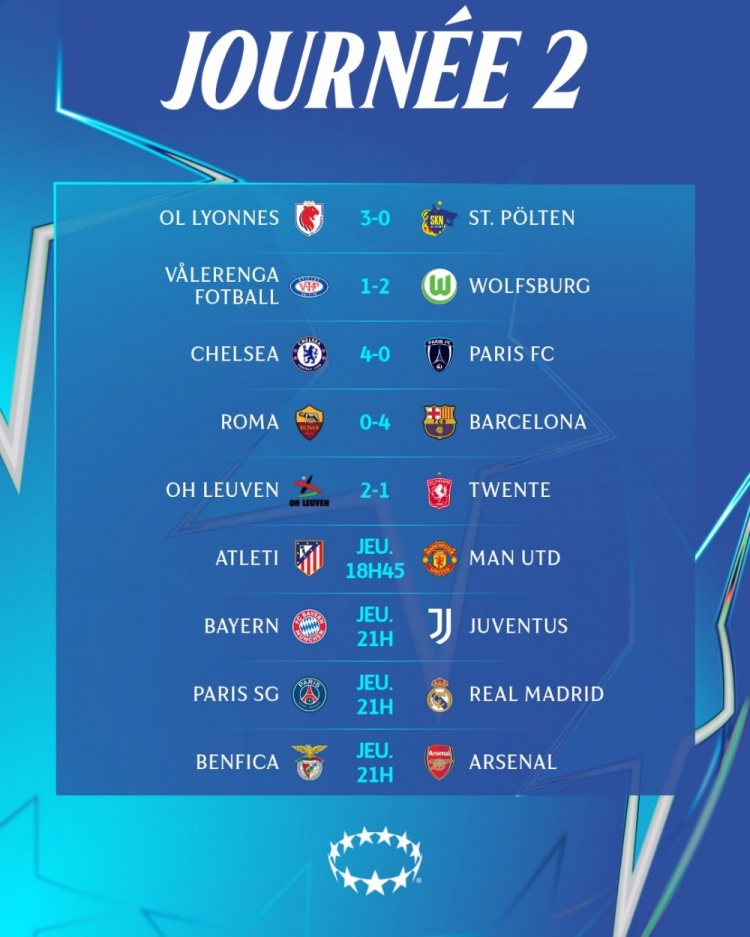 女足欧冠联赛阶段第二轮部分比赛结果: