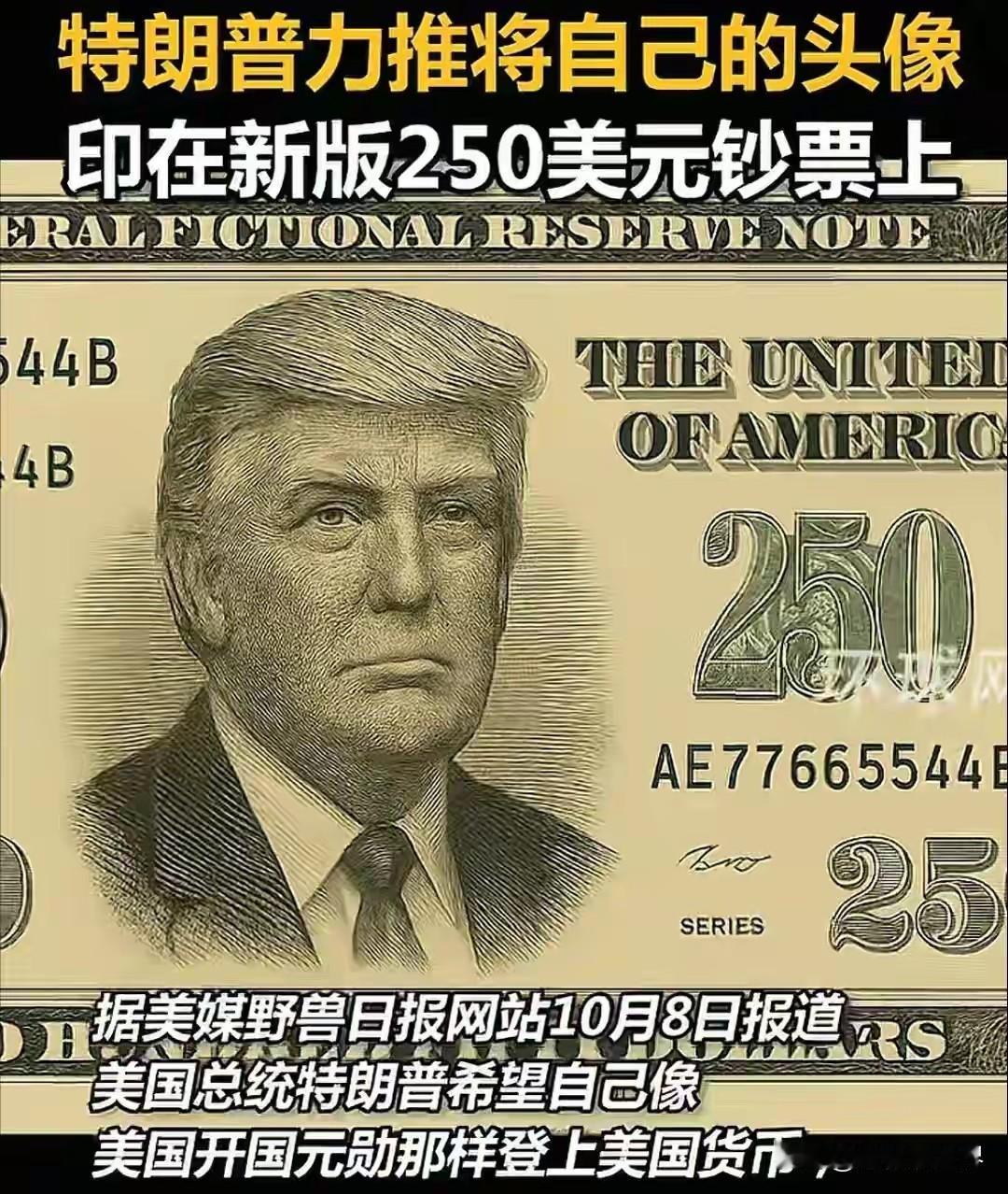 不想当将军的士兵不是好士兵,不想印到钞票上的二百五不是纯粹二百五! 总统先生,建议您把面值改为290,多好啊!250+38+2!横竖就是不靠谱嘛,大一点更好!二百五美元
