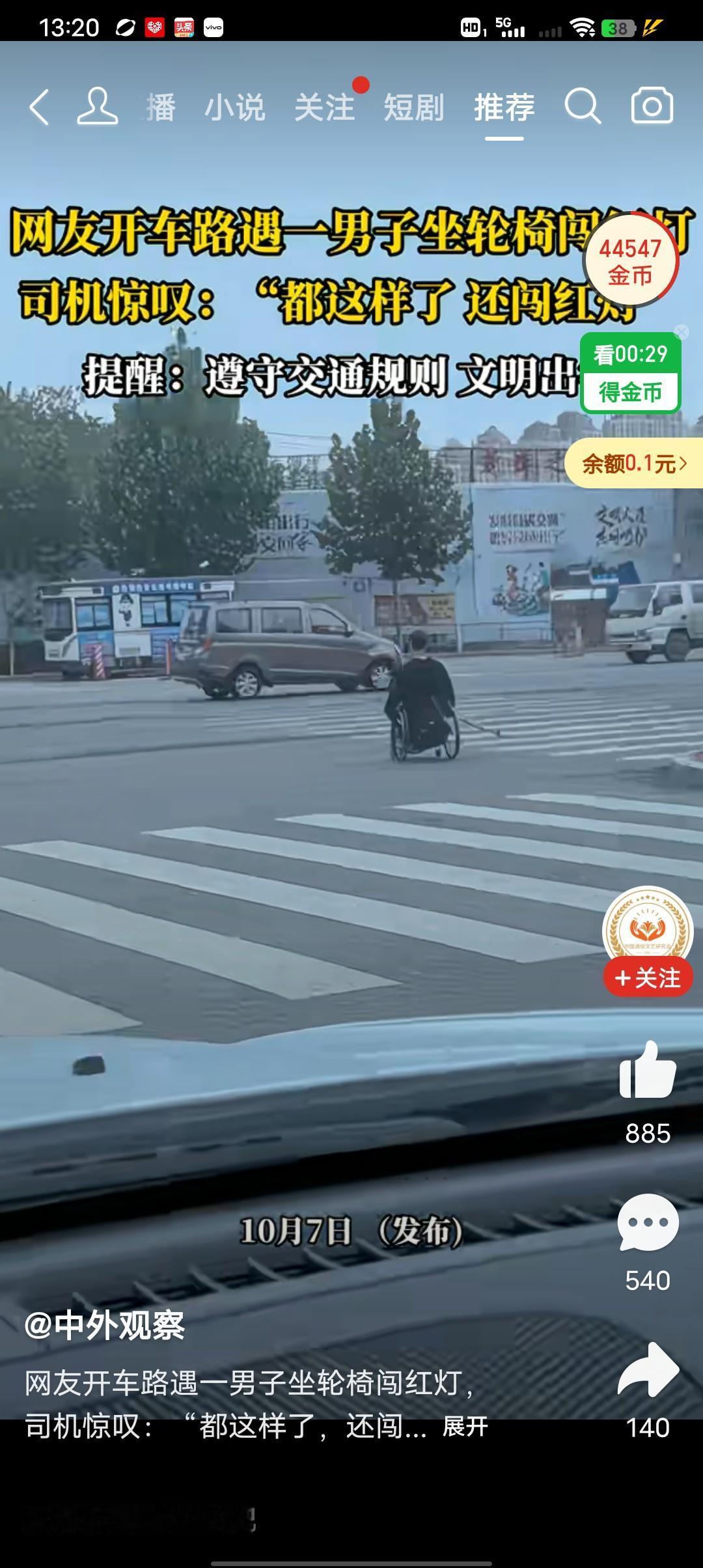 看看这位佩服不?坐轮椅闯红灯的“勇士” 网友开车路遇一男子坐轮椅闯红灯,网友惊叹,都这样了,还闯红灯呢?咋的,着急投胎啊?是一刻都等不了?如果都像你一样,这红绿灯还有啥用? 别拿自己的命不当回事,也不要给别人找事,你自己作死别拉别人垫背。 最讨厌闯红灯的,不但扰乱交通还祸害别人,这样一个月让他坐轮椅真吗冤枉他!好好遵守交通规则不行啊?偏偏来个不一样,你碰上一个技术不行的,当场就给你送走,你信不信? 都作成这样了,还不消停,早晚得出事!有人说,这就是想为家里想法挣钱呢。