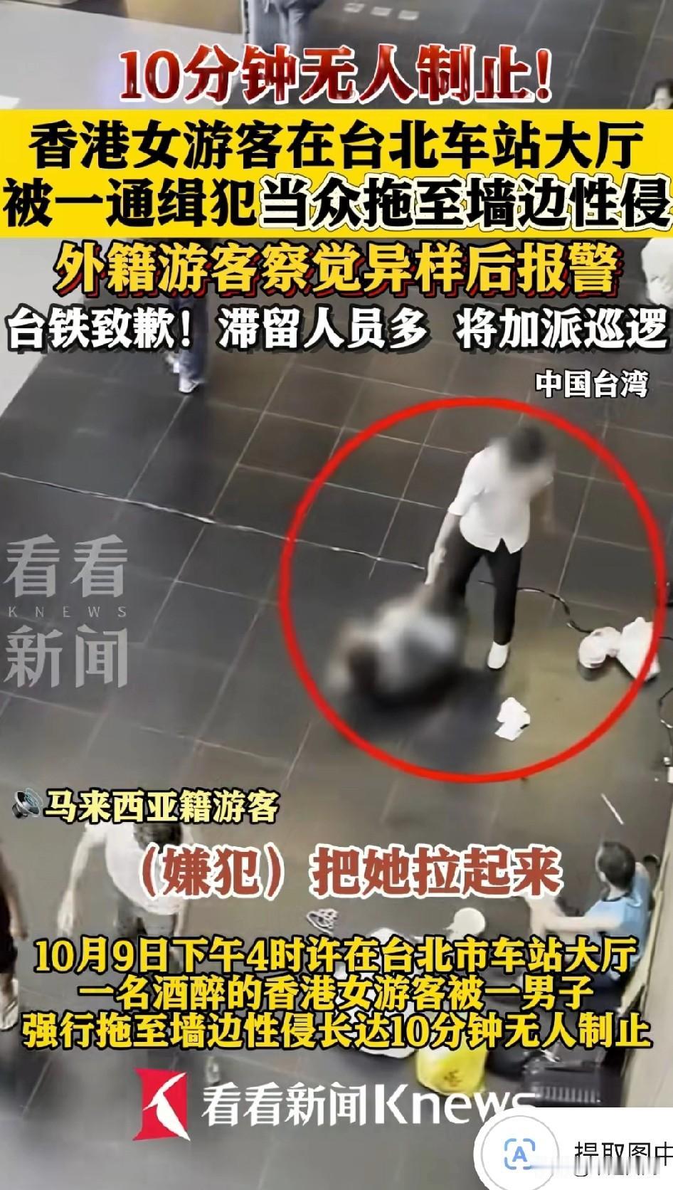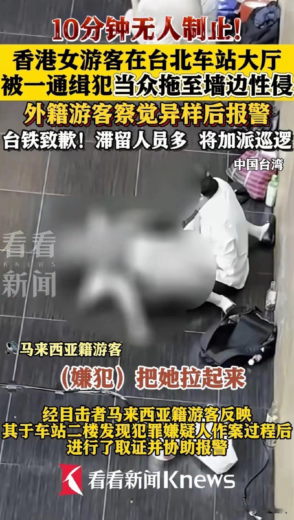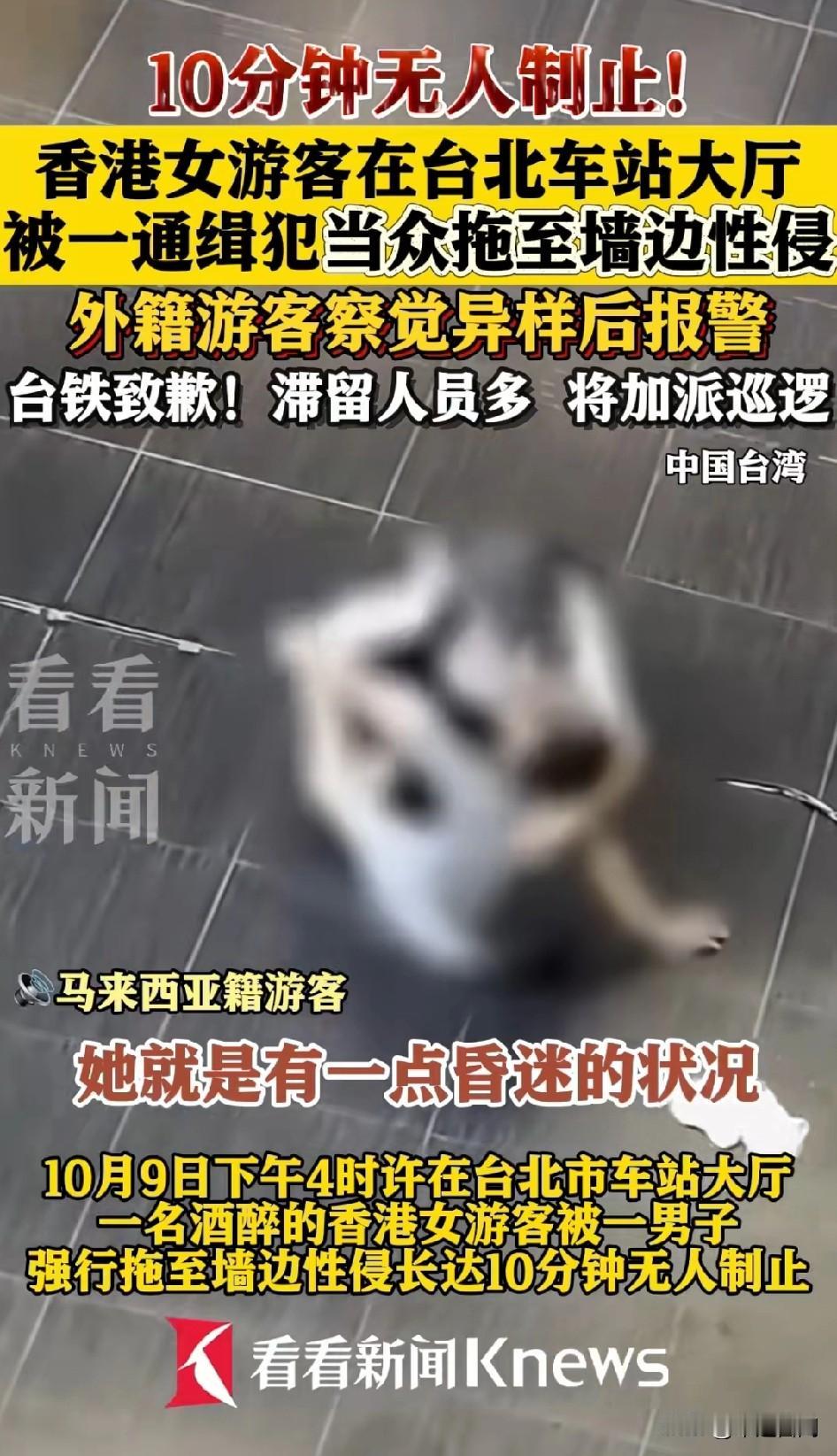 香港女游客在车站被性侵达10分钟! 台北车站大厅上演骇人一幕:一昏迷女子遭通缉犯拖至角落性侵,整整10分钟无人施援。 直至马来西亚游客察觉异样取证报警,嫌犯才落网。 此事件暴露公共空间安全漏洞,台北铁道部致歉,并反思因为人员太多导致,引发社会对治安管理及旁观者效应的深刻反思。