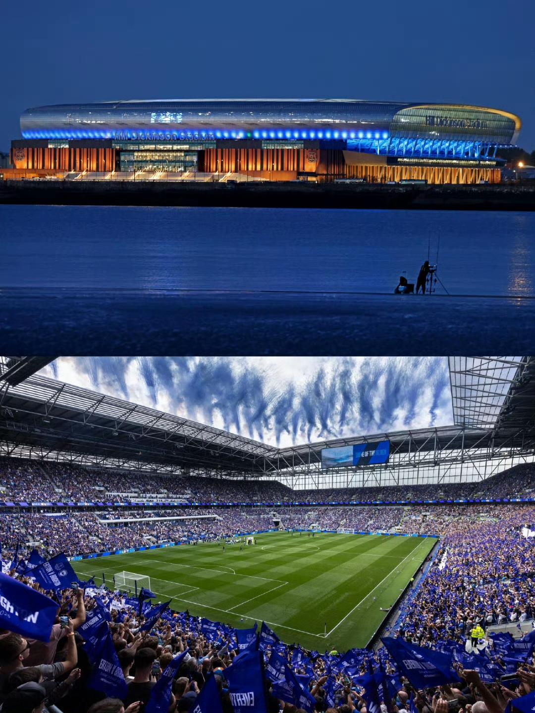 埃弗顿的新球场好漂亮,他们也曾经是英甲豪门,可惜英超时代落魄了。 主场一片蓝色,对应死敌利物浦的红色。 落魄的主要原因是利物浦是一座小城市,金元足球时代,老板都喜欢伦敦球队。 所以切尔西被看中,成为蓝色的代表。 埃弗顿能在英超就不错了,9个联赛冠军呀,当年要是拿一次欧冠,说不定现在还是豪门呢![可怜]