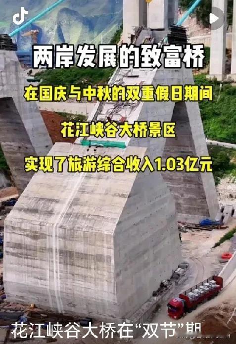 这座花江峡谷大桥耗费资金大约二十二亿元,在国庆的八天时间里,收入超过一亿元,如此来看,回本确实指日可待,真的很厉害,值得称赞。 这座桥着实给贵州增添了极大光彩!在二〇二五年九月二十八日通车之际,整个黔西南变得如同过年那般热闹非凡。 从设计图纸到通车典礼,这座桥的诞生本身就是一部充满智慧与勇气的奋斗史。建设团队在“地球裂缝”般的花江峡谷中,不仅要应对14级峡谷妖风的挑战,还要实现高空钢桁梁毫米级精准对接。 为了掌握风的规律,他们引入多普勒激光雷达测风系统,24小时监测风速风向,成功将施工安全风险降到最低。 主缆内部植入的光纤光栅传感器,如同大桥的“神经系统”,实时监控着主缆的应力、温度等关键参数,确保百年工程的稳固性。这些科技创新,不仅让大桥成为世界桥梁建设的标杆,更让黔西南的天堑变成了通途。 通车后的花江峡谷大桥,展现出了惊人的“流量虹吸效应”。 国庆期间,22.12万人次游客慕名而来,带来1.03亿元旅游综合收入。景区内,空中咖啡厅、无绳蹦极、高空玻璃观光大厅等业态,让游客在体验世界级工程的同时,也能感受心跳加速的刺激。 更重要的是,大桥将周边黄果树、万峰林等著名景区串联成线,形成“速度与风景同行”的高效旅游动线,带动沿线景区搜索热度同比增长超178%。这种“超级工程+旅游”的模式,不仅重塑了贵州的旅游格局,更让“桥旅融合”成为推动区域发展的新引擎。 对于当地百姓来说,大桥通车带来的红利更是实实在在。贞丰县平街乡的梁再芳,在大桥通车前就看准商机,将自家房屋改造成餐馆。 如今,她的餐馆日均接待20余桌客人,年收入超过十万元。关岭县花江镇的卜彪,将诊所与民宿结合,三、四层的客房增设泡池和药浴套房,计划在旅游旺季大干一场。 据统计,大桥通车后,周边村寨新增民宿24家、餐馆25家,带动800余人就业。曾经的穷乡僻壤,如今成了创业热土,村民们在家门口就能实现增收致富。 然而,这座超级工程的价值远不止于此。作为贵州融入西部陆海新通道的重要节点,花江峡谷大桥将贵阳、安顺、黔西南城市群的资源互通时间大幅缩短,为区域产业协同发展按下“加速键”。 贞丰的花椒、六枝的猕猴桃等特色农产品,通过大桥快速出山,物流成本降低的同时,也打开了更广阔的市场。 新能源电池材料、民族工艺品等特色工业产品,借助大桥的交通优势,正逐步走向东南亚市场。可以说,这座桥不仅是物理意义上的交通枢纽,更是推动区域经济发展的“黄金纽带”。 随着桥旅融合项目的不断完善,花江峡谷大桥的未来发展前景更加值得期待。景区规划中的库湾空中公园、桥塔酒店等业态,将进一步丰富游客体验。 预计全年最大承载游客量可达149万人次的目标,也为当地旅游经济注入了强劲动力。而随着“交通+农业+旅游”融合发展的深入推进,黔西南的乡村振兴之路将越走越宽。 这座“横竖都是世界第一”的花江峡谷大桥,用22亿元的投资,在八天内创造了过亿收入的奇迹,更用科技创新与民生关怀,书写了新时代的“贵州速度”与“中国智慧”。它不仅是贵州的新名片,更是中国基建强国的生动缩影。 各位读者你们怎么看?欢迎在评论区讨论。