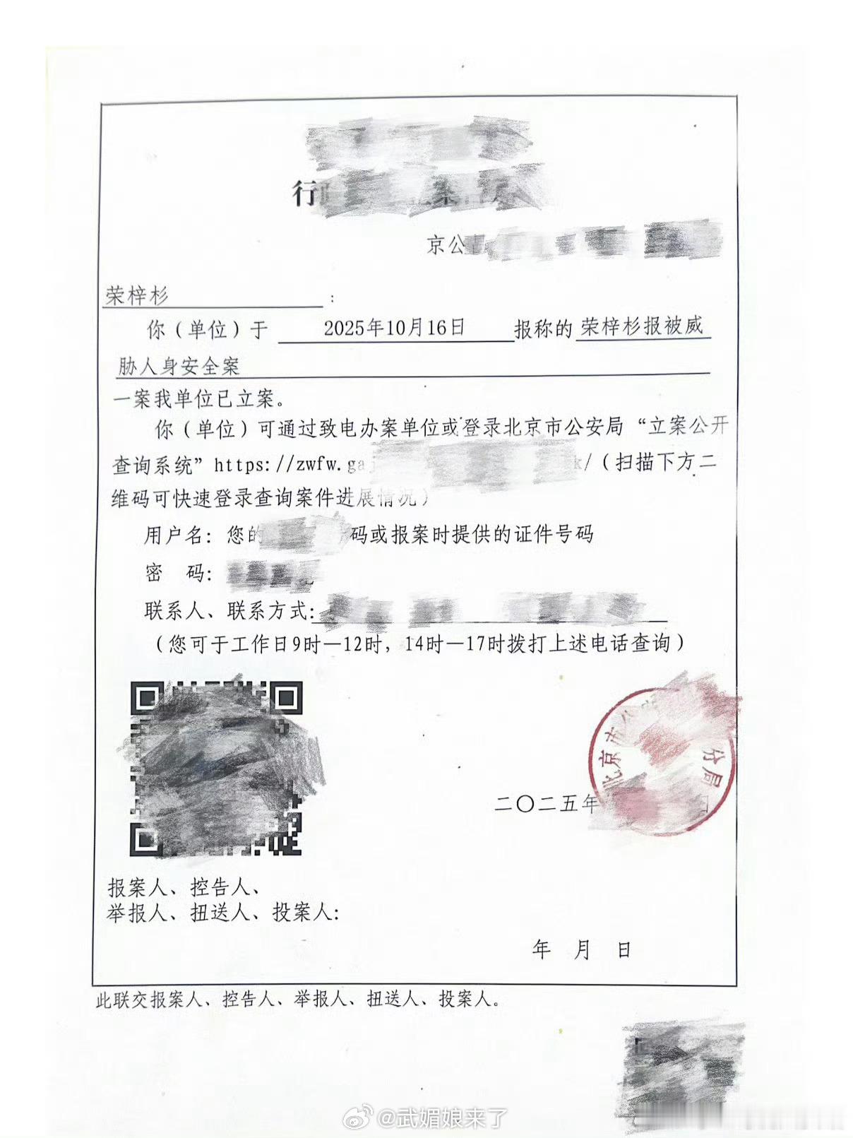 荣梓杉工作室发了声明和 报警回执,报警内容是被威胁人身安全。