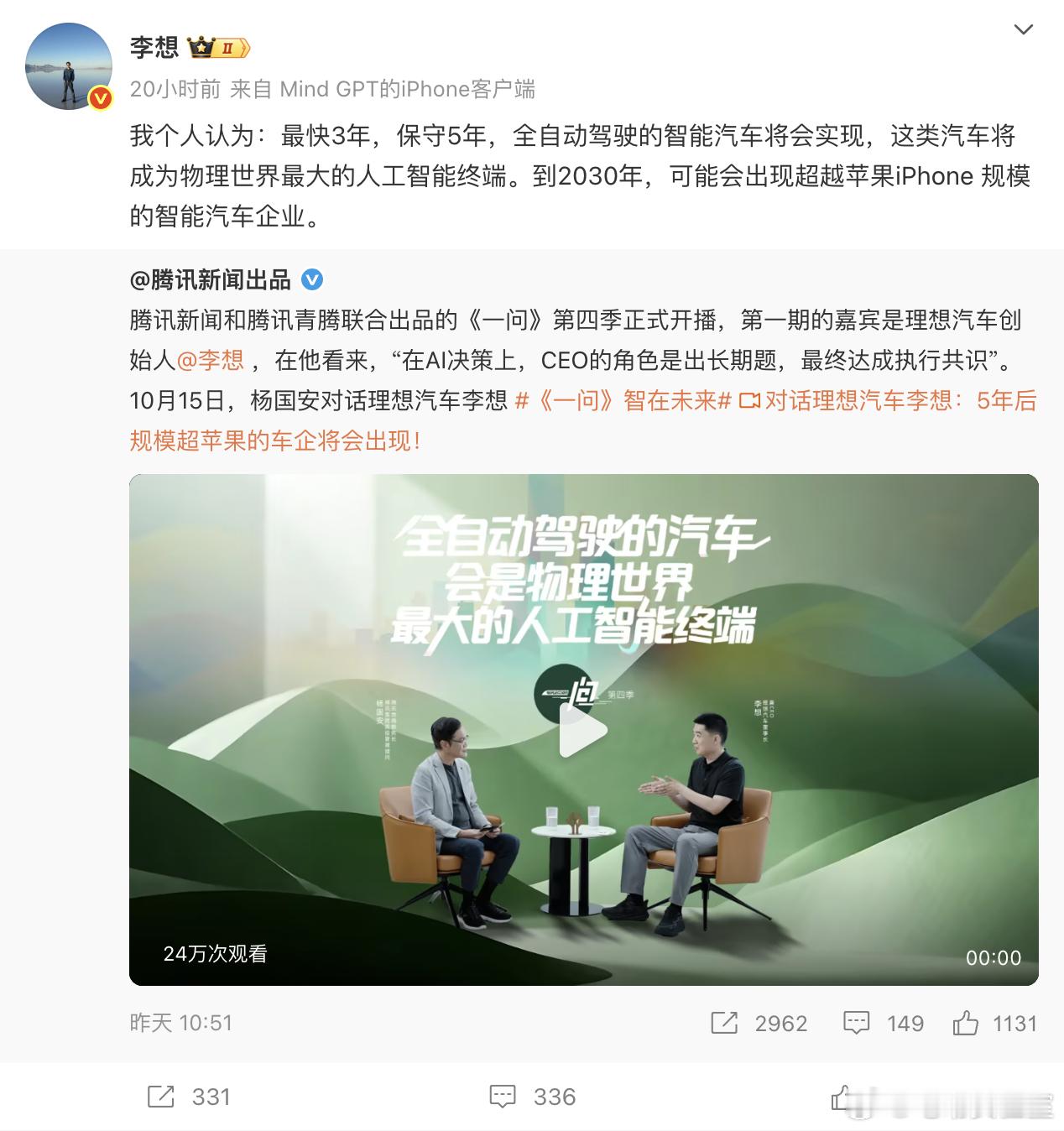 理想汽车CEO在日前表示:「最快3年,保守5年,全自动驾驶的智能汽车将会实现。
