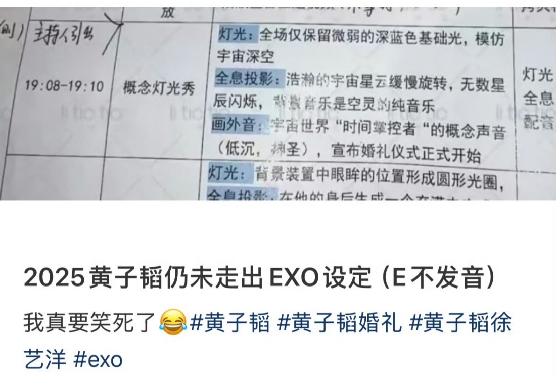 我真绷不住了哈哈哈哈看到网传的黄子韬徐艺洋婚礼流程中有一项是用“时间掌控者”的声音宣布婚礼仪式开始,这不是黄子韬当年在EXO的超能力吗!TAO酱,2025了你还没忘了EXO的设定吗,主婚人要不然考虑考虑请李秀满吧🤣🤣