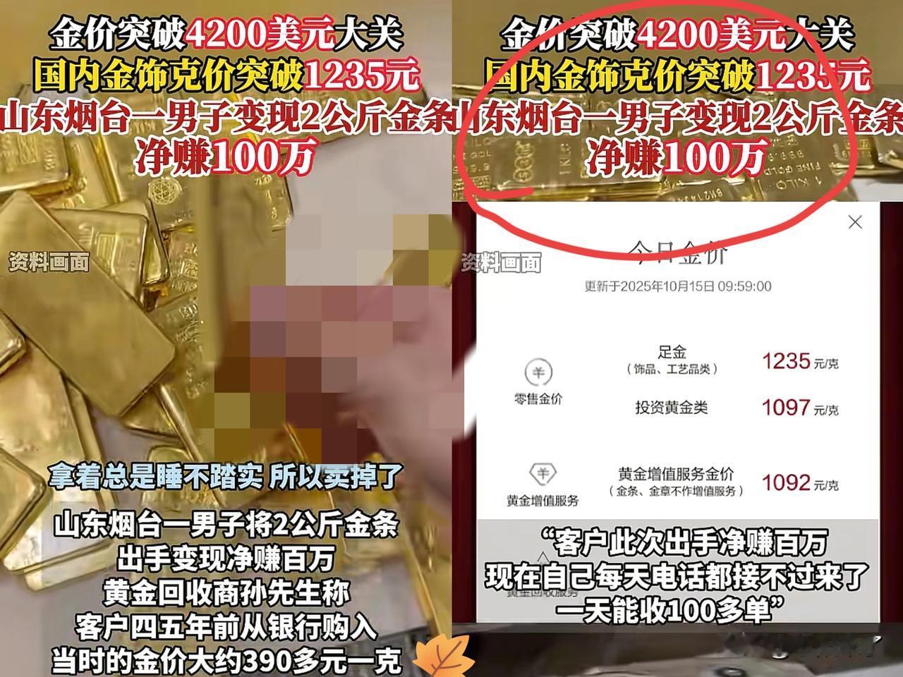 山东烟台, 男子看到黄金又暴涨,终于忍不住出手,将手里2公斤金条变现,直接净赚百万 当年390元/克买的,现在金价飙到1200元,他说“看着金价天天涨,揣着金条都睡不踏实”,这话听着凡尔赛,却真让人眼热! 今年黄金涨得离谱,现货价涨超57%,回收店都排起队了,有人卖囤的金条,阿姨翻出压箱底的金镯子,小伙子连前女友送的金项链都拿来变现,全是奔着高价套现来的! 可这边欢天喜地,那边有人快愁秃了头,尤其是要结婚买“三金”的年轻人! 去年100克的金饰套装8万就能拿下,今年直接飙到11万,平白多掏3万,有个准备明年结婚的小伙,攒了10万现在还差3万,吐槽“工资涨得像蜗牛,金价涨得像火箭”! 别光羡慕大哥赚钱,他可是等了四五年才等到这波行情! 普通人可别盲目跟风:现在金价这么高,再冲进去大概率买在山顶;金饰有工艺费,回收时还得打折,根本不是投资的料! 真要碰黄金,自己戴就按需买,别囤;想投资就选金条,还得量力而行,千万别借钱跟风! 你身边有人趁这波金价操作了吗?是赚了一笔还是被难住了?