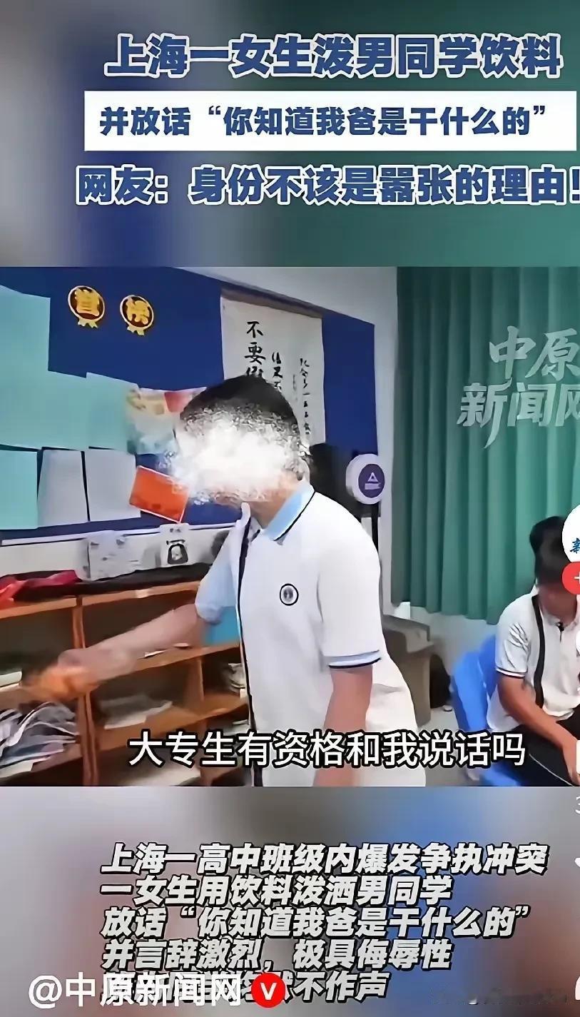 继我爸是李刚之后,上海又出来一个爸爸厉害的人。 通过发出来的视频显示,一女生不仅高喊着我是高一的,随时来找我,并羞辱对方:“我一点不好惹,你一个大专生有什么资格跟我说话,你知道我爸是干什么的么? 视频刚流传开,评论区就炸了锅。没人关心争执的起因,所有人的注意力都钉在“你知道我爸是干什么的么”这句话上,还有那句扎心的“大专生有什么资格跟我说话”。这两句话像两根刺,扎中了公众对“拼爹”乱象的敏感神经,也戳破了某些人根深蒂固的学历偏见。 “大专生没资格说话”的论调,放在当下尤其刺眼。上海早就明确把“第一学历歧视”写进劳动监察,企业要是搞学历门槛得自己拿出没歧视的证据,已有23家企业因此交了罚款。 全国政协委员袁亚湘都直言,“第一学历”本身就是个歧视性概念,国家教育部门从来没认可过这种说法。可这女生张嘴就来的羞辱,暴露的不仅是无知,更是一种被惯出来的傲慢——仿佛学历标签能定义人的全部价值,家世背景能成为伤人的武器。 更让人不适的是那句“你知道我爸是干什么的么”。 这话太耳熟了,十几年前“我爸是李刚”的嚣张还没完全淡出记忆,后来又陆续出现“我爸是黑社会”“我老公是公安局的”这类叫嚣。这些相似的句式背后,藏着同一种扭曲的认知:身份和家世能凌驾于他人尊严之上,能绕过基本的待人之道。 没人知道这女生的父亲究竟是做什么的,但她脱口而出的依赖,已经说明家庭教育里藏着的病灶——或许是家长日常处理问题时习惯亮身份、讲关系,或许是有意无意给孩子灌输“我们比别人高人一等”的观念,才让一个高一学生养成如此霸道的行事风格。 男生的反击看得人五味杂陈。他不是一开始就动怒的,是在被当众贬低学历、被饮料泼身之后才忍无可忍。 这反击里藏着的,可能是长期被学历标签困扰的委屈。现在早不是只看学历的年代了,字节、华为这些企业早把技能成果权重提了上来,一个能拿出手的项目链接,抵得过半所985的学历分。 大专生在技能领域的优势越来越受认可,可社会上残留的偏见,还是会像针一样扎人。女生的羞辱,恰好戳中了这种偏见带来的痛点,也点燃了积压的情绪。 同学拉开的是肢体冲突,却拉不开某些人心里的认知鸿沟。这女生或许到最后都没明白,她真正丢人的不是没打赢架,是把“我爸”当成护身符的浅薄,是把学历当成武器的狭隘。 “拼爹”从来换不来真正的尊重,北京电子科技职业学院那名喊着“我爸是黑社会”的学生,最后也只落得法律的惩处和舆论的谴责; 青岛那位叫嚣“我打你怎么了”的路虎女司机,再嚣张也逃不过行政拘留的处罚。历史早把道理摆得明明白白:家世和学历能给人起点,却给不了做人的底线。 这事更该敲醒的是背后的家长。孩子的言行就是家庭的镜子,那句“你知道我爸是干什么的么”,大概率是家里听惯了的话。 如果家长总把身份地位挂在嘴边,总用学历给人分三六九等,孩子自然会学去这种傲慢。真正的家庭教育,该教的是“尊重”二字——尊重别人的学历,也尊重自己的人格;尊重规则的公平,也尊重他人的尊严。 社会对“拼爹”事件的敏感,本质是对公平的渴求。从“我爸是李刚”到现在的“你知道我爸是干什么的么”,公众愤怒的从来不是某个人的嚣张,而是特权思维对公平的侵蚀。 好在现在的社会正在慢慢变好,上海用法律打击学历歧视,企业用技能替代名校标签,这些变化都在告诉所有人:真正的底气从来不是“我爸是谁”,而是“我是谁”“我能做什么”。 这起冲突终会过去,但留下的反思不该停。学历从来不是划分人的标尺,家世更不是欺负人的资本。一个人的教养,藏在对陌生人的态度里,藏在尊重他人的言行里。当“拼爹”的叫嚣越来越少,当学历歧视越来越淡,社会才算真正拥有了温度。 各位读者你们怎么看?欢迎在评论区讨论。