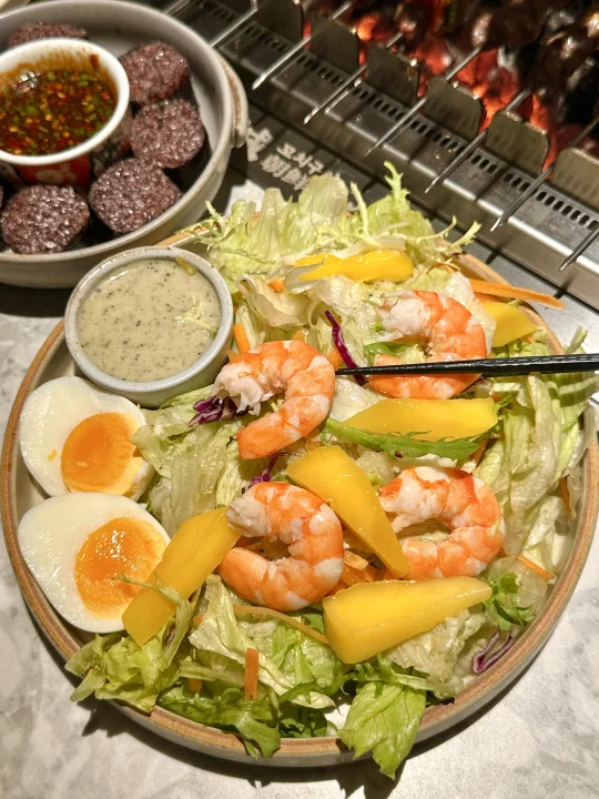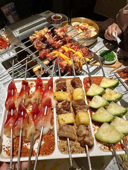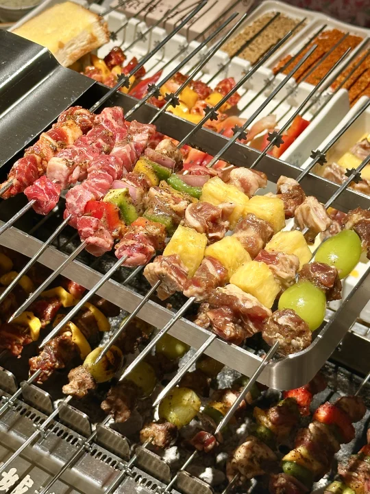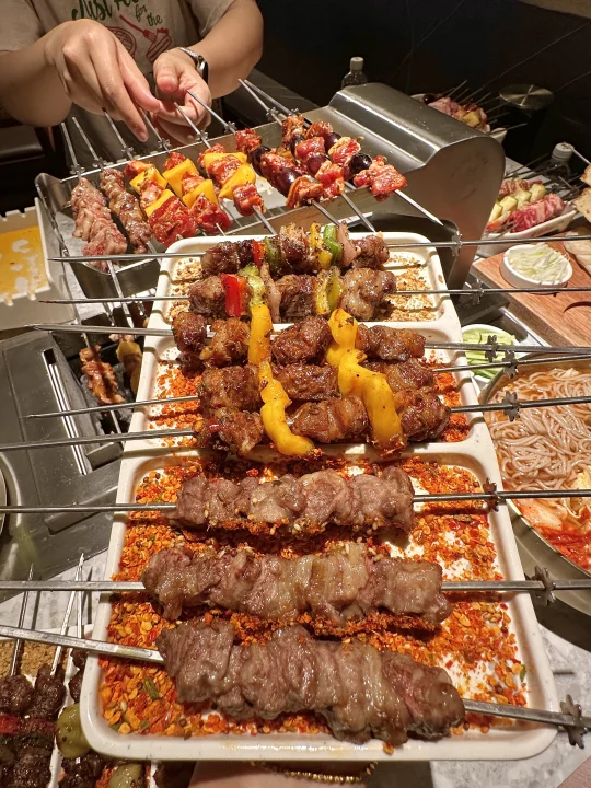 值得我坐20站地铁来!来吃的都是学生党和打工族!宫后夹肉、青梅酵素烤牛肉串、菠萝蜜牛肋条、炭火烤的ju香🥹🥹大串又好吃…我们盲点了一桌都不踩雷