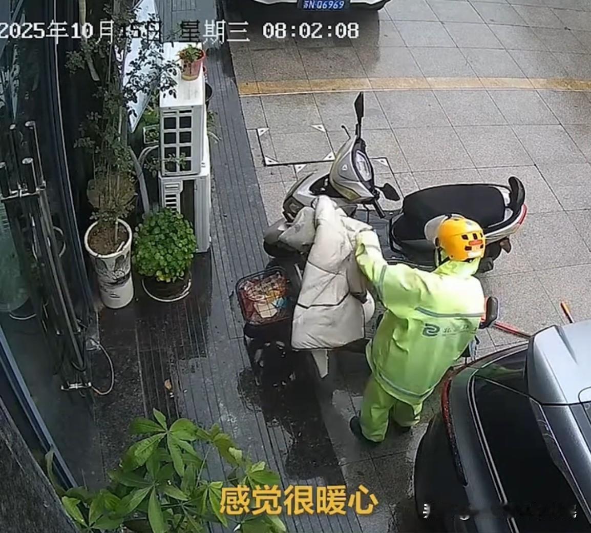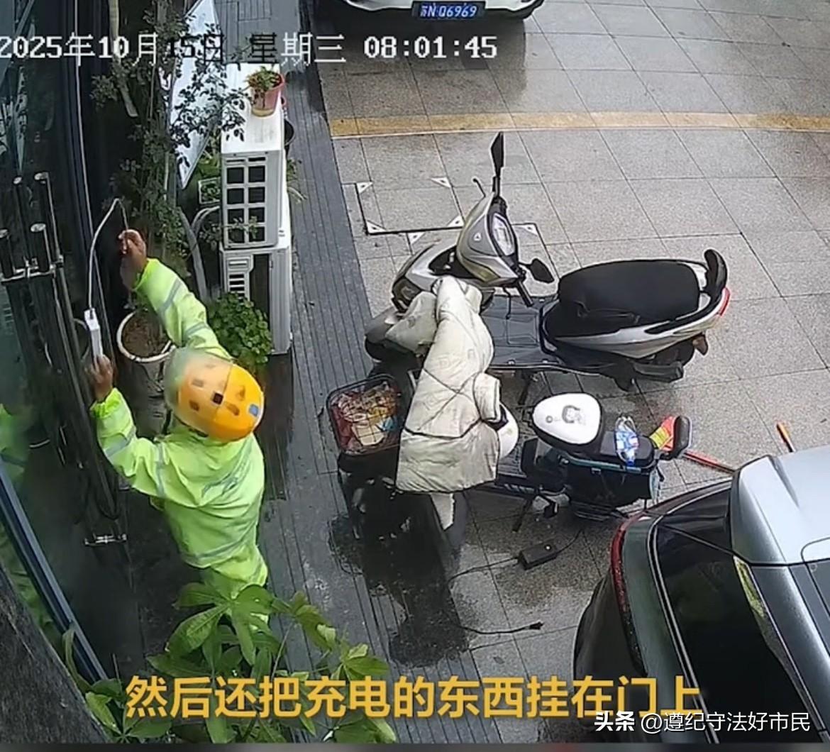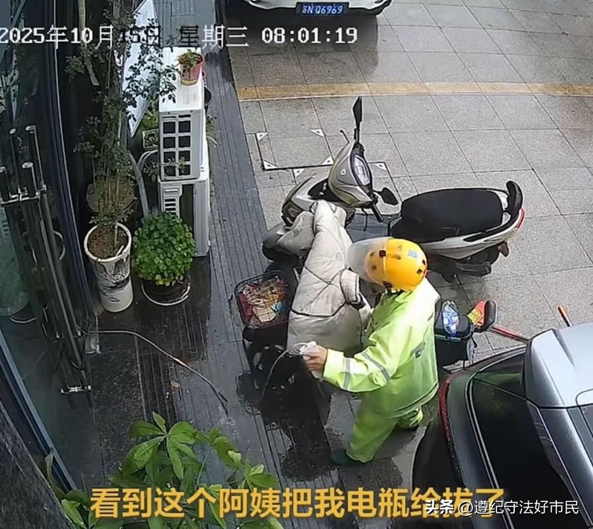 善良不分职业 商店的店主前一天晚上给电瓶车充电 但是忘记拔充电线了 第二天早上开始下雨 保洁阿姨上班看到电瓶车在雨中充电 赶紧跑过去把已经充好电的充电器 和插排收拾好 为了防止充电的这些东西丢失 还贴心的把它们挂在门上 店主上班以后觉得很奇怪 然后查看了视频 才知道是保洁阿姨的善良行为 店主感到很暖心 决定以后把店里的纸箱都送给保洁阿姨 看吧,善良的人不争不抢就会有好的结果降临在身上