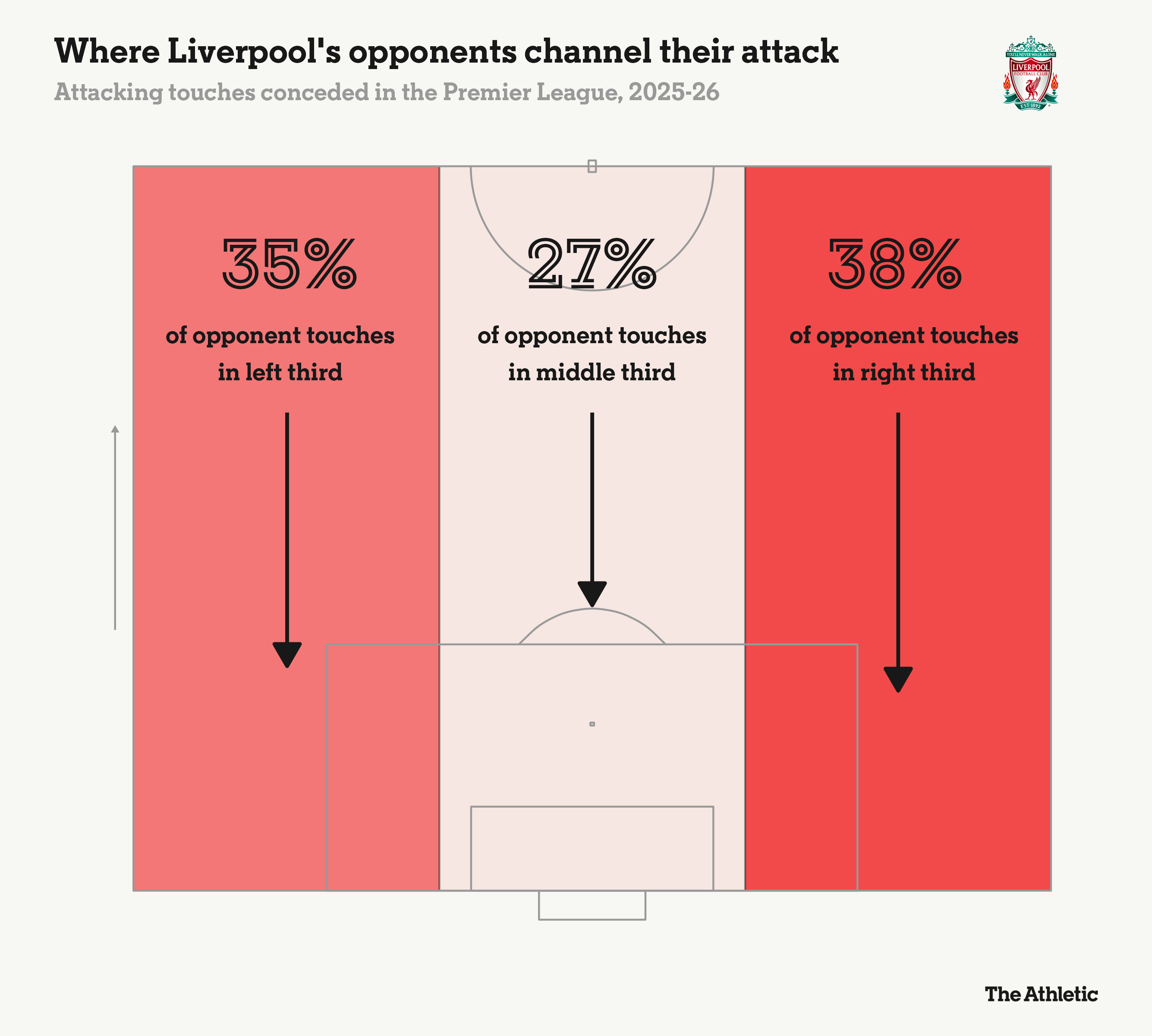 雪上加霜的是,利物浦本赛季至今已有5名球员先后担任右后卫一职。在斯洛特确定右后卫的稳定人选之前,英超各队的分析师们已得到明确的短期信号——主攻利物浦右路。本赛季,对手38%的进攻触球都发生在这一侧。