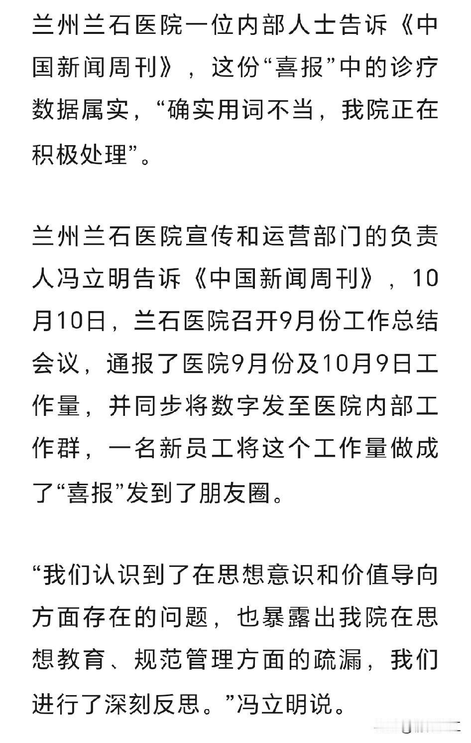 医院的社会职能和责任就是救死扶伤,让老百姓恢复健康。作为医院内部的统计数据,门诊诊疗数据可以作为医院工作效果的参考,但是把医院的门诊诊疗人数作为一种喜报来宣传,那就是有违医院的职责了。更有意思的是,医院把错误的责任推给一名新员工,如果不属实,只是找一个“背锅侠”,那么医院就是丧失最基本的诚实和信誉。