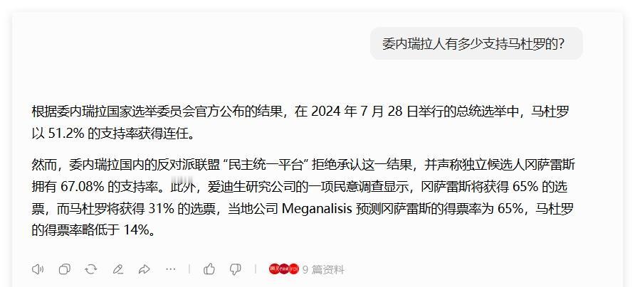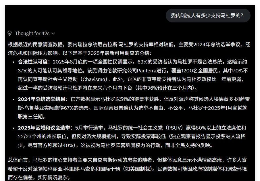 问了豆包和Grok同一个问题:委内瑞拉人有多少支持马杜罗的? 图1是豆包的答案,