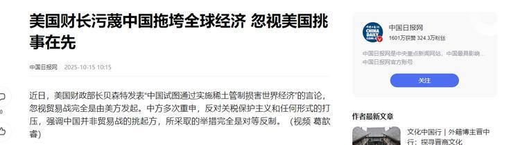 [浮云]美国财长贝森特认为,如果中国政府中的一些人想通过令人失望的行动和经济胁迫来减缓全球经济增长,那么中国经济将受到最严重的伤害一毫无疑问:这是中国与世界的对抗。 贝森特的这番话,不止是无知,更是恶意,作为经济学家出身,本该懂市场规律,却选择站在政治讲台上,为美国那套“脱钩”把戏摇旗呐喊。 2025年美国经济数据通胀虽降了点,但失业率在关键州隐隐反弹,制造业回流喊了几年,实际效果呢?供应链还乱成一团。 而中国,面对外部压力,经济总量预计突破140万亿元,占全球17%的体量,却贡献了30%的增长动能。 国际货币基金组织最新展望,直接把中国增速预期上调,承认中国仍是全球增长的“主引擎”。 贝森特要是真为全球好,为什么不直面自家问题?为什么不承认,中国的新能源出口电动车、太阳能板、锂电池正帮全世界加速绿色转型 2025年上半年,中国这些领域的出口增幅保持在50%以上,不是在“胁迫”,而是在提供实惠,推动联合国可持续发展目标。 贝森特的指责,不过是酸葡萄心理:中国做到了你们喊了多年的“绿色革命”,你们却只能靠补贴和壁垒勉强跟上,这不是对抗,这是领先,你跟不上就直说,何必拉着全世界下水? G7会议上,贝森特呼吁“协调行动”反击中国“经济胁迫”,但现实呢?欧洲国家已经在抱怨美国关税伤及自家,加拿大媒体直呼这是“不合理贸易战”。 中国对关键矿物的管理,是为了可持续供应链,不是针对谁,相反,美国的出口管制,从芯片到软件,层层设限,2025年5月还明文禁昇腾芯片,这叫公平竞争? 中国商务部公告直指,这是歧视性措施,中国已启动反歧视调查,贝森特,你这是在教唆盟友自断臂膀。 全球经济需要合作,不是对抗,中国“一带一路”倡议,已覆盖150多个国家,帮发展中国家建基础设施,拉动当地增长。 罗马尼亚前总理阿德里安·纳斯塔塞直言,贝森特对“一带一路”的攻击,其实是承认它的成功。 中国不是在胁迫,而是在分享红利,2025年,中国经济增量预计超35万亿元,比世界第三大经济体总量还大,这份贡献,谁敢小觑? 贝森特的指责,不过是秋后的蚂蚱,蹦跶不了多久,中国不是对手,而是伙伴,世界够大,容得下共赢,何必非得对抗? 面对这种甩锅,你怎么看?是继续听华盛顿的单边独奏,还是相信数据说话,支持真正开放的经济? 信息来源:中国日报网 美国财长污蔑中国拖垮全球经济 忽视美国挑事在先