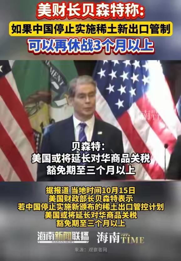 美财长贝森特称:如果中国停止实施稀土新出口管制,可以再休战3个月以上!中方回应 10月16日,外交部发言人林剑主持例行记者会。 卡塔尔阿拉比电视台记者提问,美国财长贝森特暗示,美国有可能延长对中国商品加征关税的暂停期,来换取中国推迟实行稀土出口管制计划。中方对此有何评论? “我们已多次阐明在稀土出口管制和中美经贸问题上的立场。”林剑表示。 美国这番表态像极了菜市场讨价还价。三个月休战期?仿佛在施舍珍贵礼物。要知道中国稀土储量占全球三分之一以上,美国进口的稀土八成来自中国。这不是简单的商品交易,而是关乎国家战略的底线问题。 稀土被称为"工业维生素",从战斗机到新能源汽车,缺少它就等于掐住现代工业的咽喉。中国过去几十年承担了全球九成稀土供应,却长期以白菜价出售。这种局面早该改变。 美方试图用关税暂停作为筹码,暴露了其霸权思维。他们似乎忘了贸易是双向车道。中国去年从美国进口农产品价值超过400亿美元,这笔账美国人算过吗?单方面施压的时代已经过去。 看看历史数据就知道稀土的份量。2010年日本曾因稀土进口受阻,整个电子产业陷入恐慌。现在美国面临的不仅是供应链风险,更是技术迭代的卡脖子难题。 林剑发言人的回应看似平淡,实则重若千钧。"已多次阐明立场"这句话,背后是中国对核心利益不容谈判的坚定态度。就像下围棋,我们早已跳出被动应对的圈子,开始布局长远战略。 有人总爱把国际贸易比作牌局。若真如此,中国手握的稀土王牌可不是用来换短期让步的筹码。这是守护国家发展命脉的战略资源,关乎子孙后代的福祉。 那些以为能用关税大棒迫使中国让步的算盘,该重新打打了。从光伏产业到新能源汽车,中国在多个战略领域都已建立自主供应链。稀土管制不过是在维护正当权益。 各位读者你们怎么看?欢迎在评论区讨论。