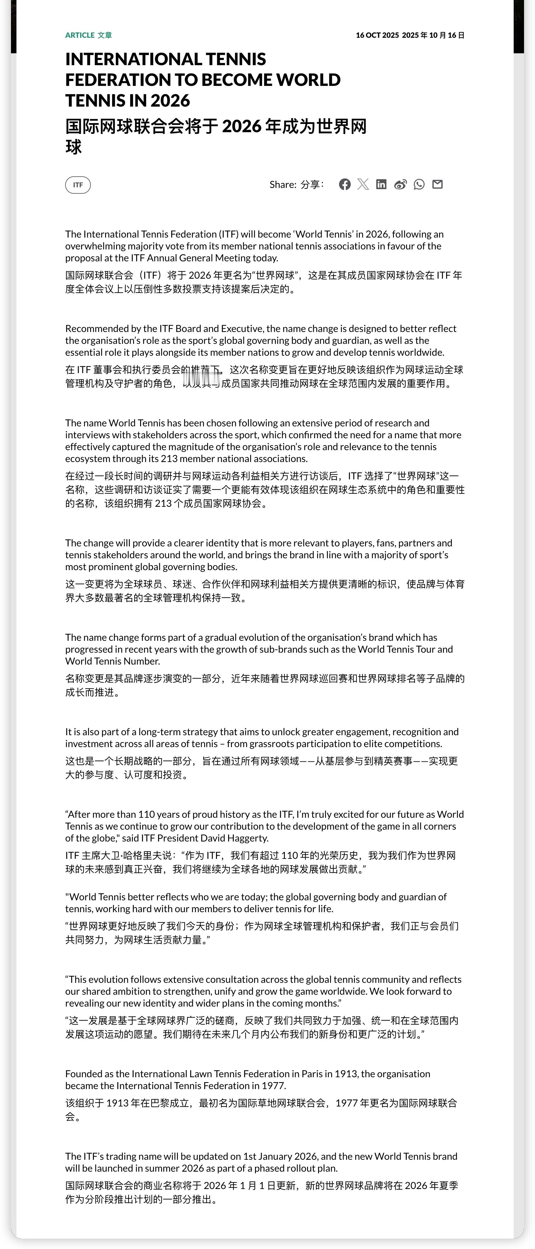 ITF(国际网球联合会)今天宣布,从2026年1月1日开始改名为World Tennis(世界网球)🎾