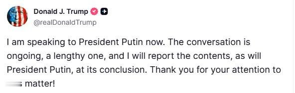 特朗普:我现在正在和普京总统通话。通话正在进行中,时间很长,通话结束后我会汇报通话内容,普京总统也会汇报。感谢您对此事的关注!特朗普称正与普京通话