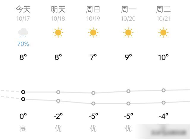 预计,18日(周六)、19日(周日)两天,气温持续低迷,最高气温维持在8℃左右。其中,18日最低气温会降至-3℃,早晨将出现初霜冻;19日至20日(下周一)早晨,寒冷将抵达本轮巅峰,最低气温降至-5℃。目前来看,未来10天,辽宁将持续“偏冷模式”,全省平均气温较常年偏低2℃到3℃,大家要把厚外套、秋裤等保暖衣物提前备好,谨防感冒。