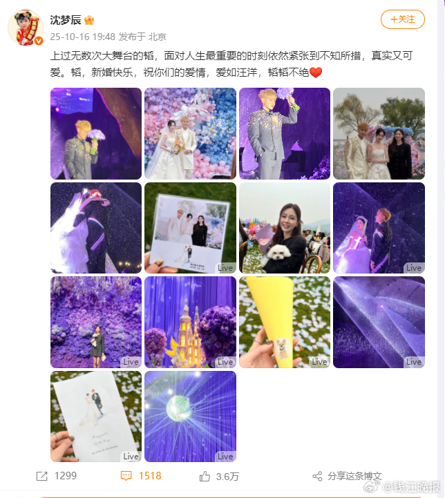 【沈梦辰晒黄子韬婚礼现场照】#谢可寅 她穿婚纱很漂亮##刘宇宁陪黄子韬敬酒# 10月16日,黄子韬徐艺洋举办婚礼,参加了婚礼并晒出现场照并送上祝福:新婚快乐,祝你们的爱情,爱如汪洋,韬韬不绝[心] #鹿晗没去黄子韬婚礼##黄子韬[超话]# ​​​