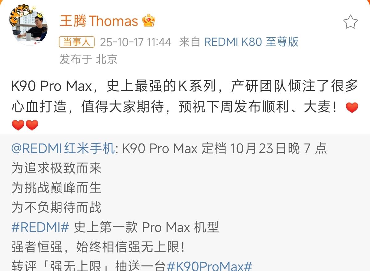 为红米K90 Pro Max打Call,王腾再上热搜! 王腾时隔1个多月再发微博,并点赞卢伟冰红米K90宣发微博,看来这个微博账号属于个人了。 同时,K90系列应该也是王腾在时跟进的项目。