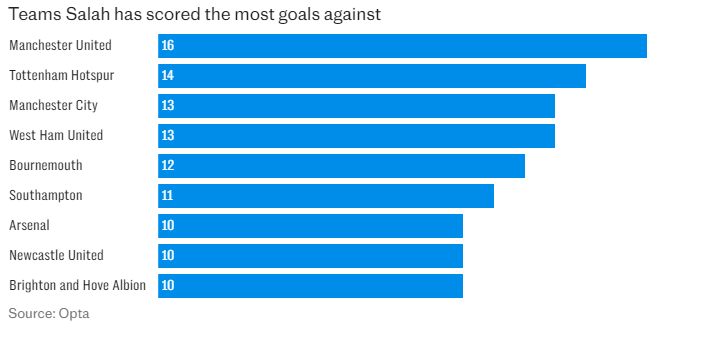 萨拉赫对阵曼联的纪录堪称惊艳:他已在对阵这支利物浦宿敌的比赛中打入16球,没有任何一支球队在他脚下吃过更多苦头。他在这场“双红会”中的总进球数,比两队任何一名球员都多7个——这进一步奠定了他“大场面先生”的声誉。