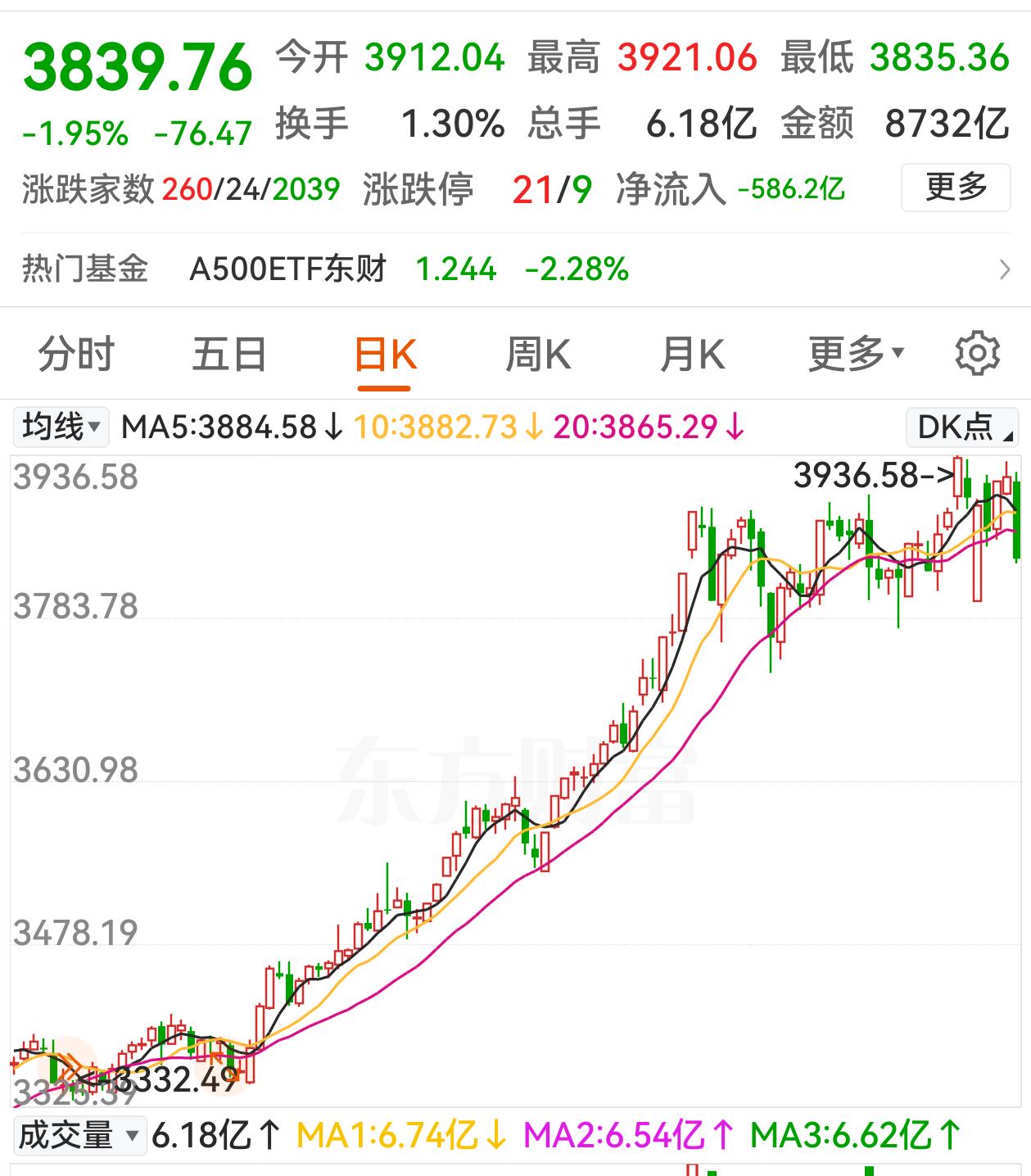该调整的还是躲不过!A股三大股指盘中跌幅均超过2%,近4800只个股下跌,成交量依然萎缩在2万亿之下。A股本周一低开高走,成功克服了外围市场影响,走出了相对独立的行情,市场期待一鼓作气,但今天午后跳水,一阴穿多线,让一周的努力付诸东流。究竟发生了什么事? 投资者信心减弱。科技股是周一反攻的龙头,但周五开盘后就选择杀跌,大盘又靠银行和红利等权重股支撑,午后权重股纷纷翻绿,市场一旦失去了托底,科技股加速、个股普跌就不再抵抗了。上证指数自8月底4000点不攻而返以来,指数围绕3900点箱型调整,已积累了大量筹码,形成了较大的上行阻力,眼看攻克4000点无望,市场信心明显不足,科技股筹码松动,权重股也不再坚守,大盘重心自然就下移了。 避险情绪升温。贸易摩擦加大,科技股阶段性调整,资金选择落袋为安,市场成交萎缩,增量资金不愿进场。今天两市主力资金净流出1322亿元,科技龙头遭资金抛售,比亚迪资金净流出19.7亿元,中兴通讯资金净流出18.92亿元,阳光电源资金净流出17.93亿元,立讯精密资金净流出16.57亿,中芯国际资金净流出14.47亿,工业富联资金净流出13.86亿元,长安汽车资金净流出12.13亿,宁德时代资金净流出11.76亿元。资金从新能源电动车流出较多,这可能与新加坡主权基金在美起诉蔚来欺诈有关。这些股是权重股,其对大盘、尤其是对创业板、科创板的影响是很大的。 外围市场共振。美国三大股指尽墨,今天亚太股市集体下跌,A股随亚太股市同步走弱,港股恒生指数下跌2.48%,日经指数下跌1.4%,澳大利亚股市跌1%,MSCI亚太下跌1%。亚太股市普遍下跌,有几大影响因素:美国区域银行危机再现,两家银行因贷款欺诈和坏账问题遭遇暴跌,人们担心会有更多的问题;有分析认为台积电明年不太可能大幅增加资本支出,OpenAI 与芯片制造商达成数十亿美元的交易,其现金消耗可能意味着芯片采购的高风险。 今天的长阴线让K线图很难看,也打击了投资者的信心,不过还是在箱型之中,慢牛预期不会改变,结构性投资机会还在。“创新成长+优质蓝筹”还是主线,三季报窗口打开,业绩超预期+业绩拐点是关注点,尽管这几天三季报预喜的公司反而大幅调整,但对估值不高的标的,调整之后还有机会,毕竟业绩是股价最有力的支撑。