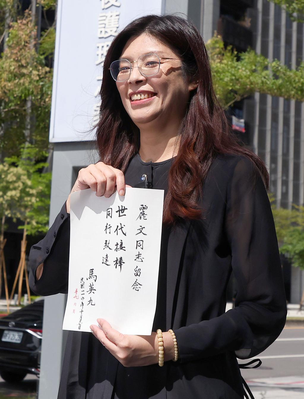 马英九手书世代接棒、同行致远赠送郑丽文。国民党主席候选人郑丽文于17日拜访了马英