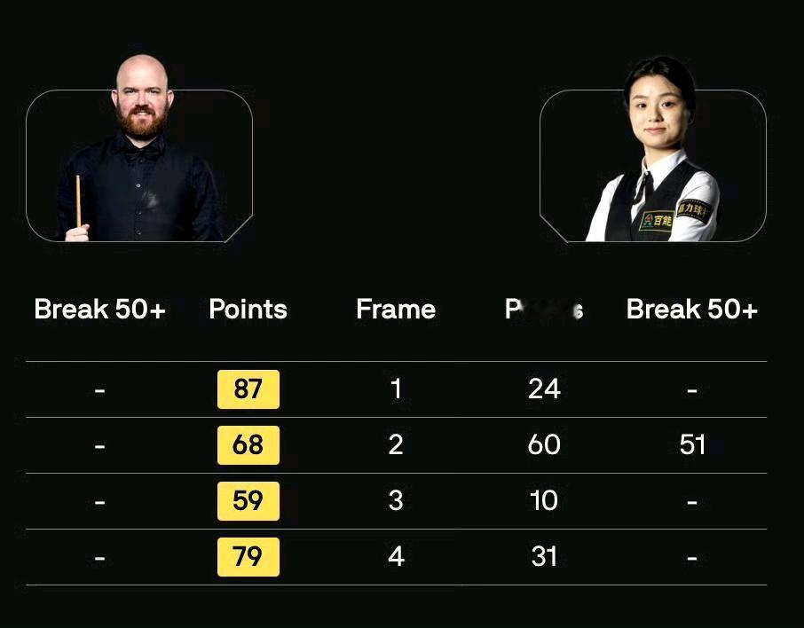 布雷切尔又退赛了,去训练铁人三项;吕昊天也退赛了,原因未知。 昨天刚刚零封晋级的白雨露今天被零封了,无缘晋级苏格兰正赛。 德比战常冰玉4-0徐思 高阳4-1唐纳森 白雨露0-4罗比威廉姆斯