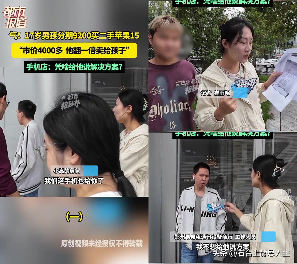 这商家的良心是被狗吃了吧! 17岁男孩小高分期花9200买了部二手苹果15ProMax,舅舅直接火了,市价才4000多,居然翻一倍卖给小孩! 商家还嘴硬:“我凭啥给你说解决方案”,那语气比谁都横。 有人说孩子爱慕虚荣,自己要的贵手机该吃教训; 有人说分期本来就贵,怪他没提前问清楚; 还有人说商家明摆着坑未成年人,这是欺诈吧? 可17岁的小孩懂啥?分期的套路、二手的行情,他能摸明白? 就算想要好手机,商家也不能往死里宰啊!二手卖新手机的价,这不是欺负人吗? 大家怎么看?是孩子该长记性,还是商家太黑心?
