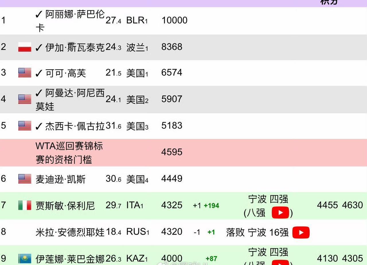 随着莱巴金娜6-2/6-0击败汤姆猫、保利尼5-7/7-5/6-3逆转本西奇晋级宁波赛四强,小米辣的年终总决赛名额告急。 保利尼 4325分 安德列娃4320分(没报东京赛) 莱巴金娜4000分 半决赛:保利尼—莱巴金娜