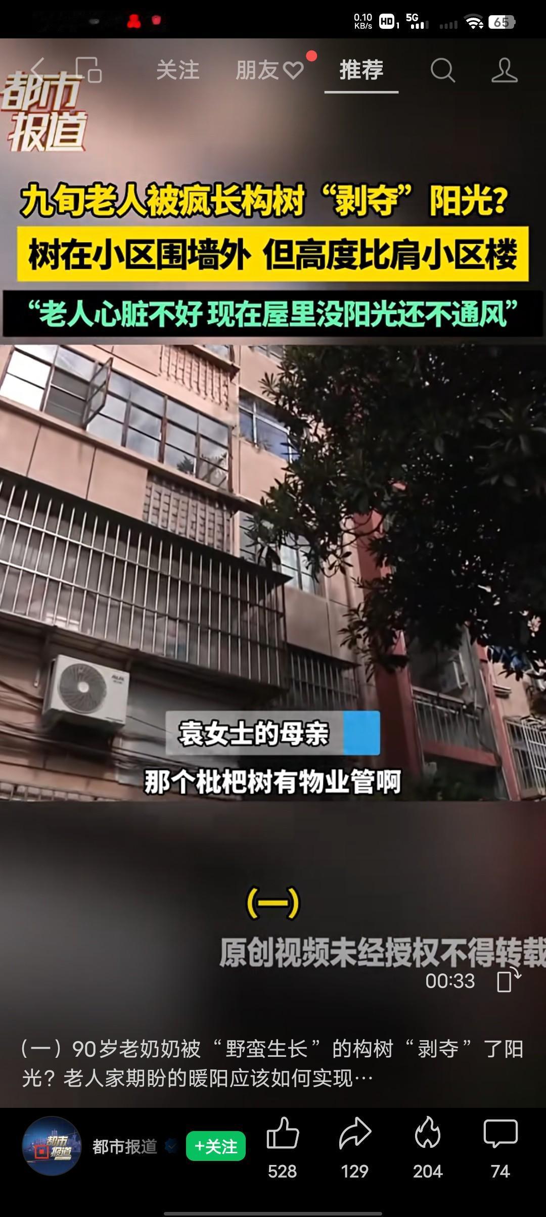 九旬老人被构树“剥夺”阳光!好奇吗? 袁女士:我妈妈九十岁了,心脏不好下不了楼,没事的时候就喜欢坐在窗前晒晒太阳。你看看窗外的大树给遮的严严实实的,阳光根本就照不进来。大树遮挡了阳光,夏天一丝风都进不了,影响风的对流,我妈说憋得慌,喘不上气, 我诉求物业把大树处理一下。 有人说,构树嘛,就是杂树,处理了也没事,也有人说,心脏不好怪树了,跟树有半毛钱关系吗?心脏不好就去治病,别找理由。也有网友说,处理并不一定全部处理了,把树冠修剪一下就好了,阳光充足才好嘛。真处理了,又会不会说光秃秃的,该绿化养护了。 也是哈,冬天喜欢阳光充足,夏天的时候就希望有大树遮阴了,就像我们的人生一样,有得有失,有利有弊,有阴有阳。所以啊,别求太圆满,人生总逃不了遗憾,你说呢?