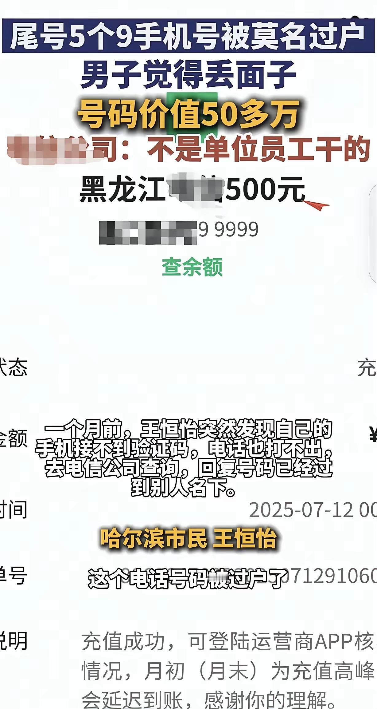 黑龙江哈尔滨,一男子10多年前,花50多万买了个尾号99999的手机号,可突然有