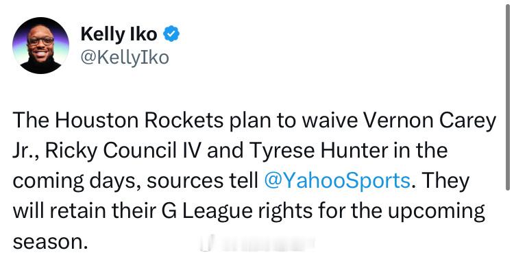 休斯顿火箭队计划在未来几天裁掉弗农·凯里、里基·康瑟尔和泰瑞斯·亨特。他们将保留下赛季的发展联盟参赛权。