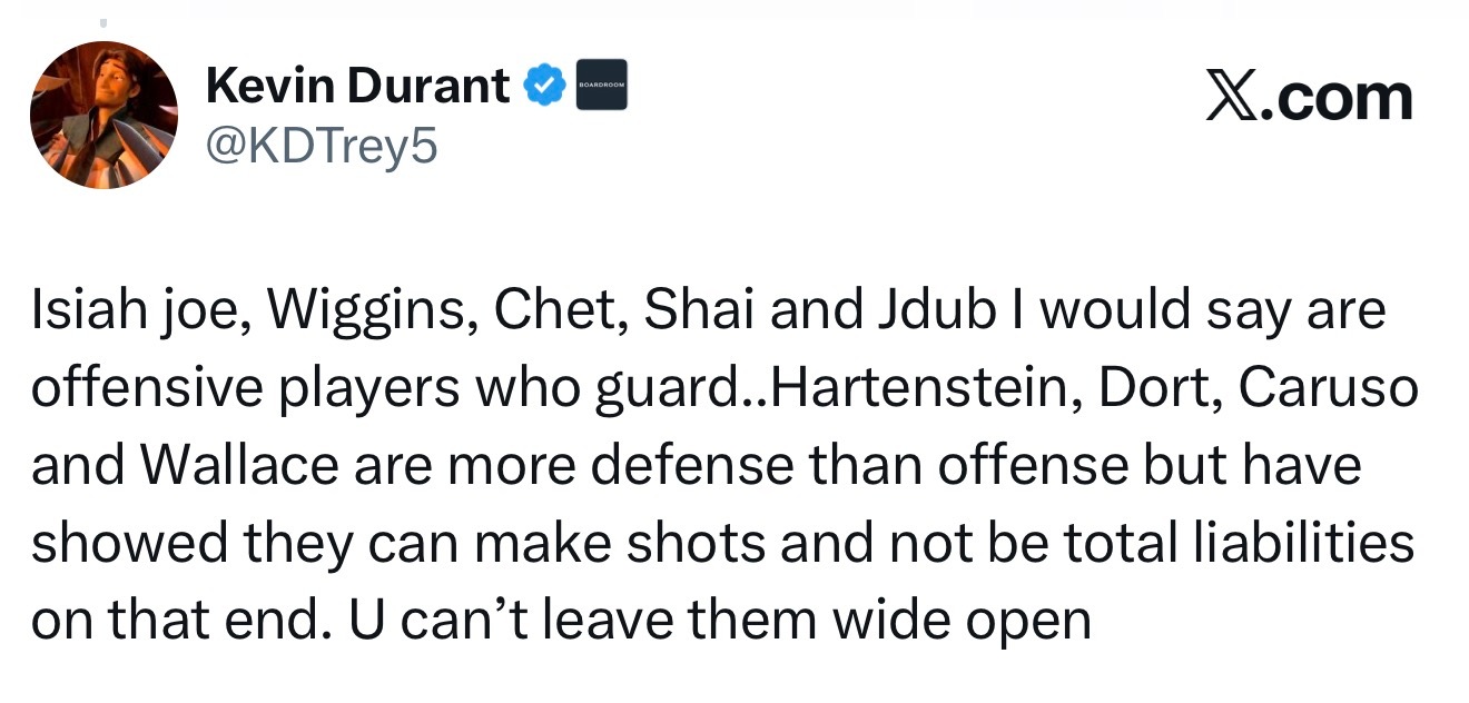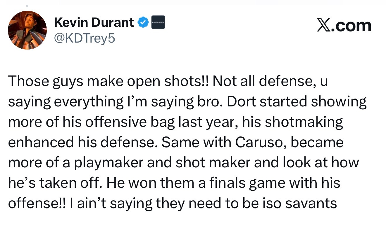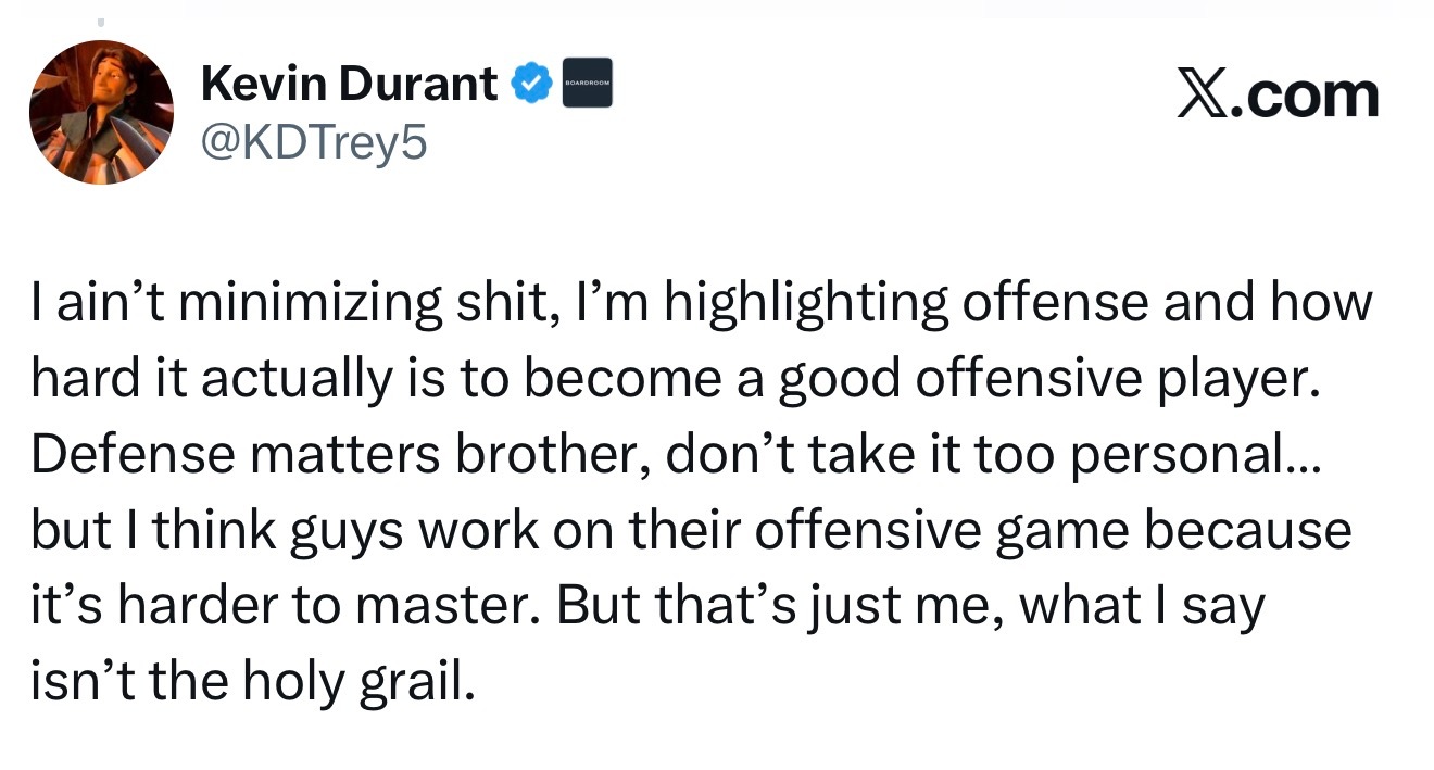 「杜兰特回复网友,讨论关于进攻与防守的价值」