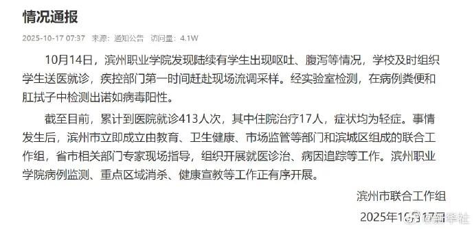 截至10月17日7时,累计到医院就诊413人次,其中住院治疗17人,症状均为轻症。事情发生后,滨州市立即成立由教育、卫生健康、市场监管等部门和滨城区组成的联合工作组,省市相关部门专家现场指导,组织开展就医诊治、病因追踪等工作。滨州职业学院病例监测、重点区域消杀、健康宣教等工作正有序开展。