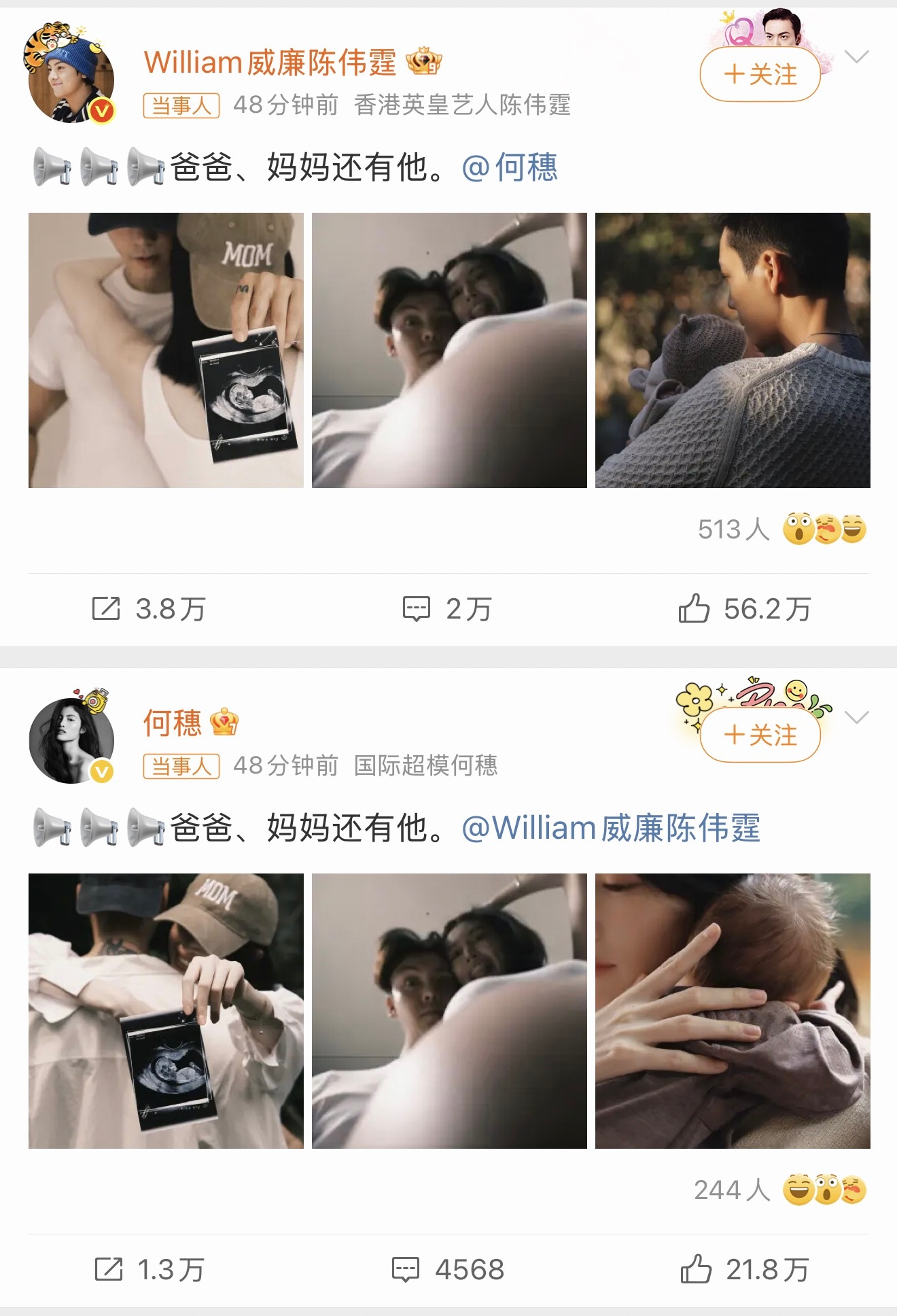 陈伟霆何穗官宣生子官宣方式有点意思,别的不说他俩的孩子颜值应该挺高的吧,基因很好,一个超模一个帅哥!