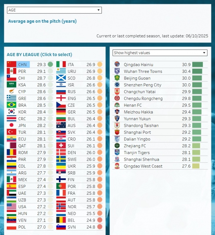 据CIES统计,在全球50个主流联赛中,中超的平均年龄为29.3岁,仍为全球最高,比第二的秘鲁联赛高出0.2岁。