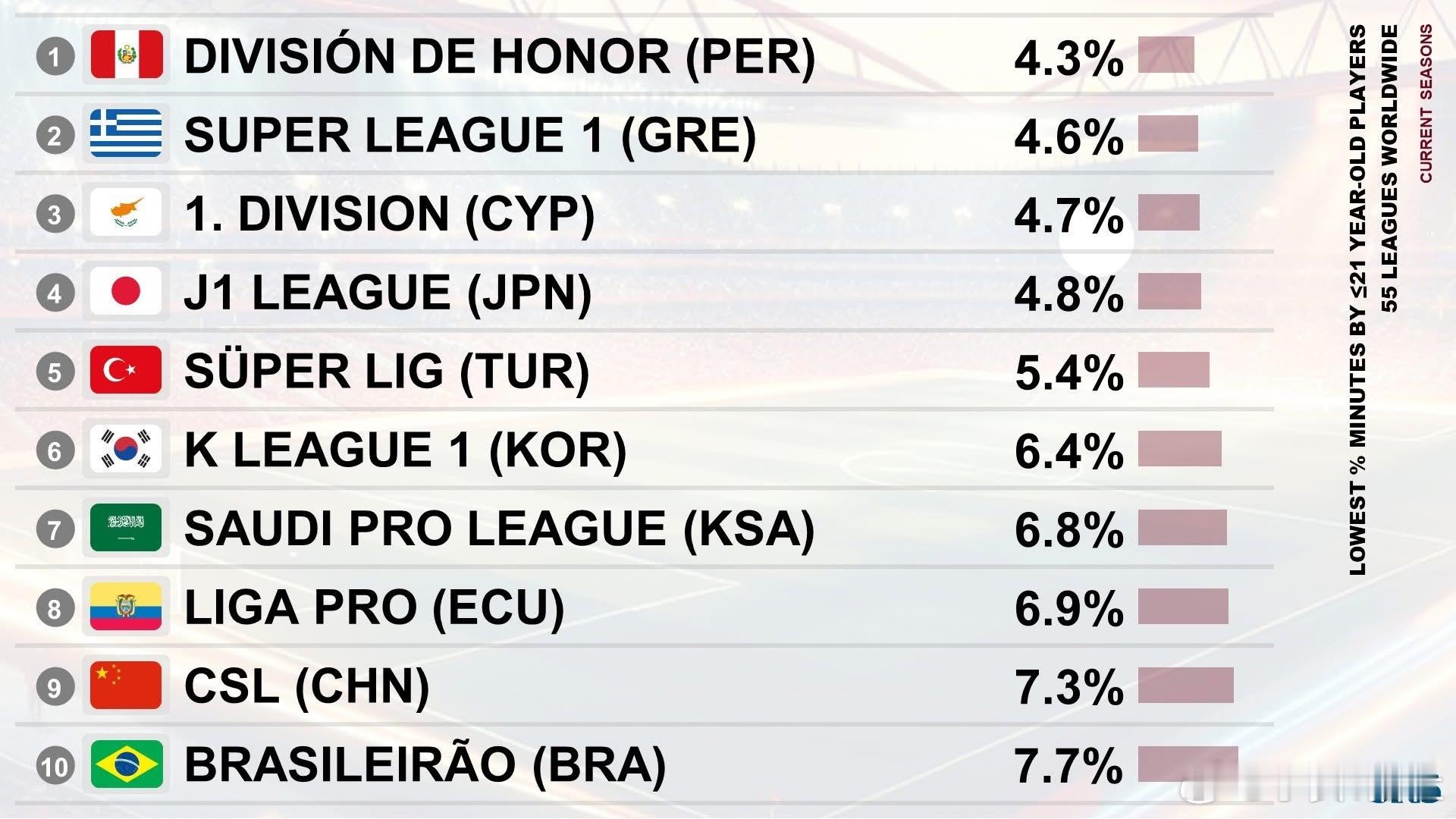 在全球55个联赛,21岁以下球员获得出场时间最少的联赛,中超排名第九。(图2)