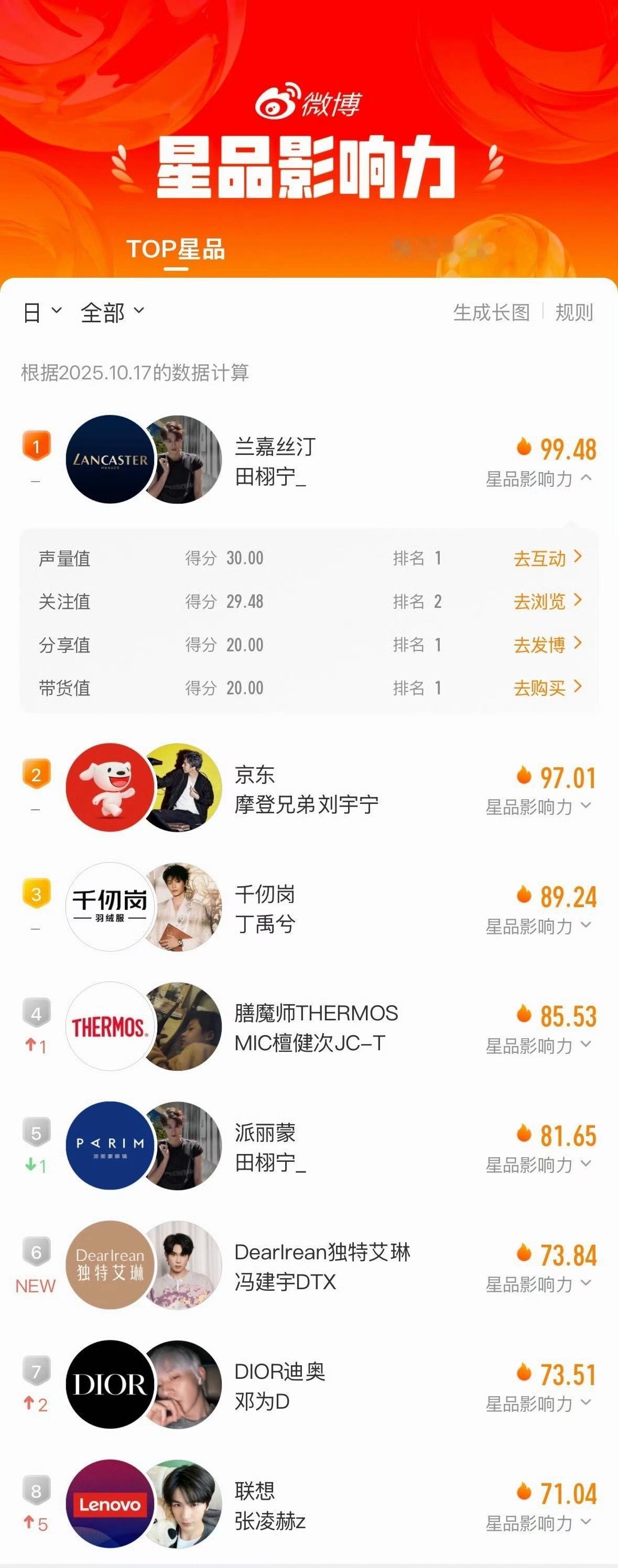 星品影响力:田栩宁刘宇宁丁禹兮檀健次田栩宁冯建宇邓为张凌赫