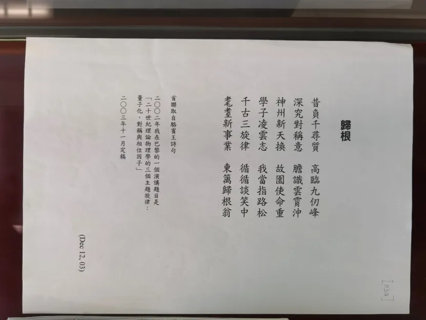 回到清华后,杨振宁为自己在清华园的家,取名“归根居”,并以《归根》为题写下诗句:“神州新天换,故园使命重。学子凌云志,我当指路松。”