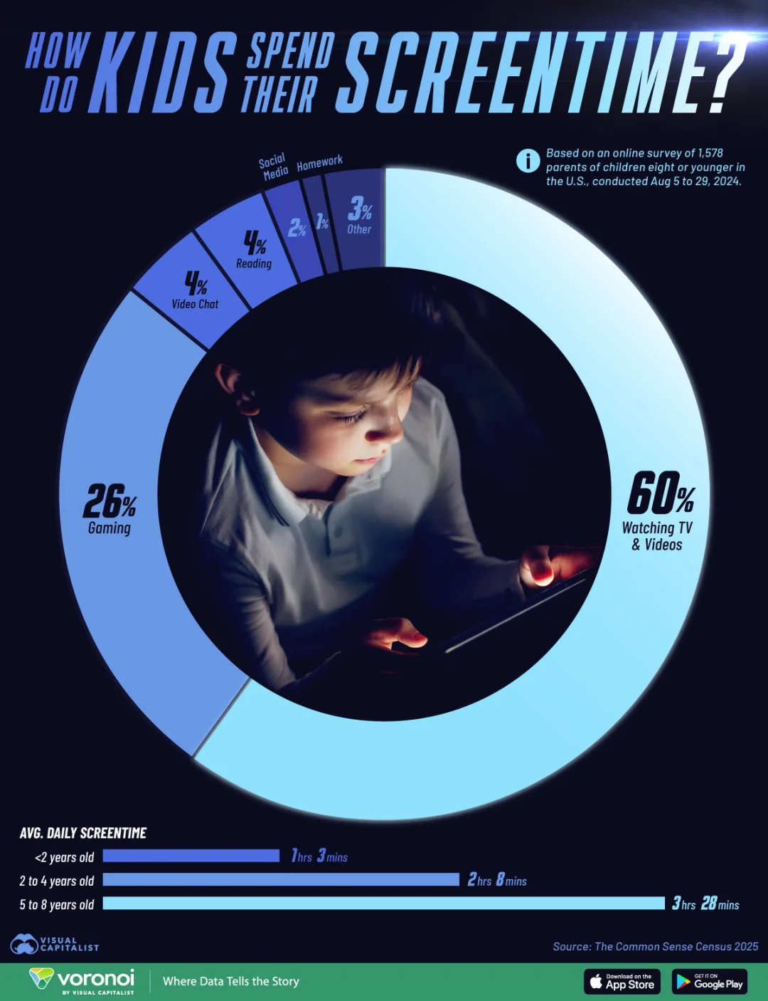 在所有屏幕活动中,60% 的时间被用来看电视和网络视频(如YouTube、Netflix等)。这意味着大多数孩子的屏幕使用仍以“被动观看”为主,而非互动学习。