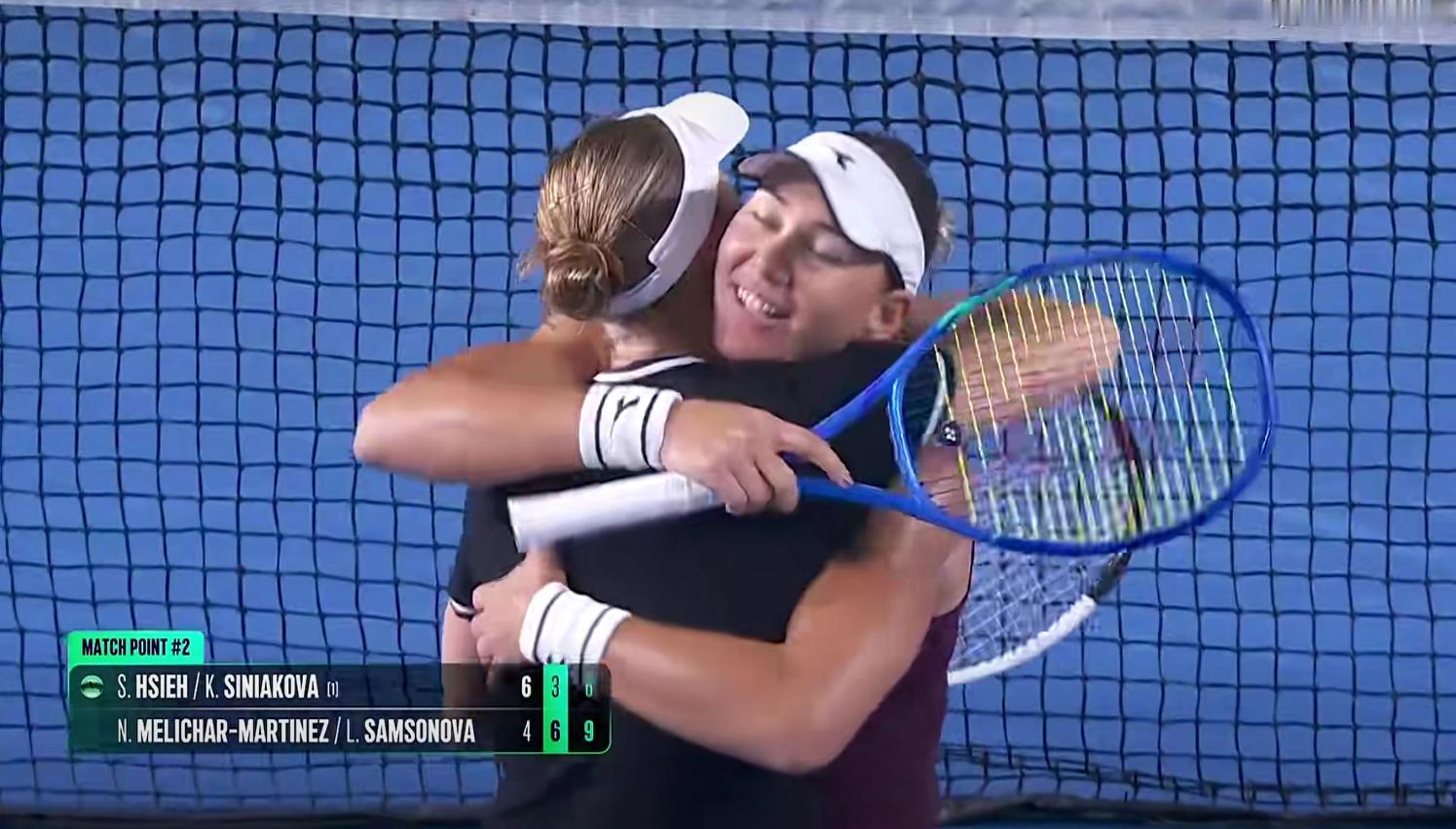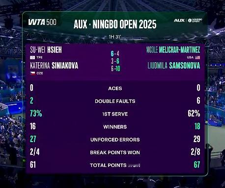 萨姆索诺娃和梅里查尔,最后抢十10-6战胜谢淑薇&斯尼亚科娃,打进2025WTA宁波网球公开赛女双决赛。