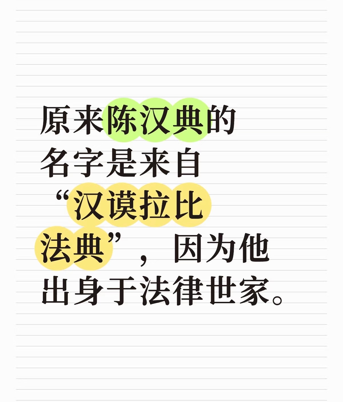 陈汉典的名字由来,取自《汉谟拉比法典》,因为他出身法学世家,所以取了一个和法学相关的名字。