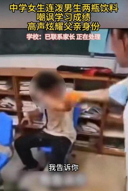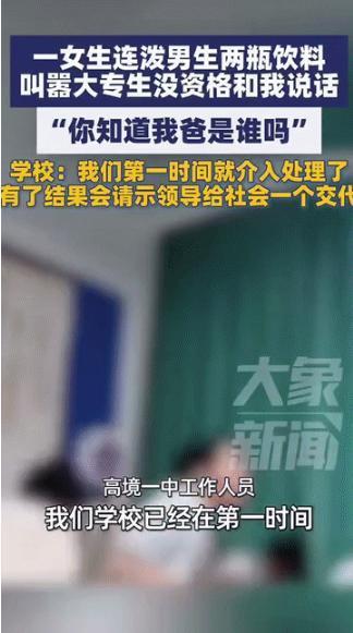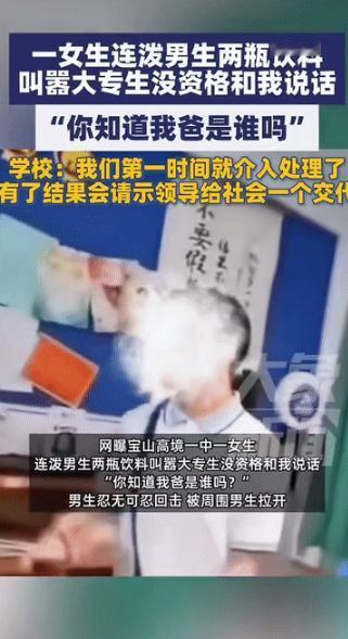 “你知道我爸是谁吗?”10月14日报道,上海一教室监控镜头下,一名女生将饮料狠狠泼向坐在座位上的男生,琥珀色的液体顺着男生的头发脸颊流淌,校服瞬间被浸染变色,这还不是结束,她紧接着又拿起第二瓶饮料继续泼洒,动作连贯而充满恶意,周围的同学被都被这一幕惊得目瞪口呆![熊猫] 上海某高中教室的监控记录下这样一幕,一名女生拿起饮料泼向坐在座位上的男同学,液体打湿了对方的头发和校服,还没等周围人反应过来,她又拿起第二瓶饮料继续泼洒。 根据现场音频,她提到了“我爸是谁”,还说出“大专生没有和我说话的资格”这样的言论,这些话比泼饮料本身引发了更多讨论。 被泼了两瓶饮料后,男生从座位上站起来反击,视频中可以看到他使用了锁喉的动作,这时教室里的其他同学立刻上前,把两人分开了,如果不是同学们及时介入,后果可能更严重。 事发当天,学校就启动了处理程序,到10月17日,学校工作人员对外回应说已经联系了双方家长,教育局也开始介入调查,校方表示会在有结果后向社会说明情况。 两个学生之间到底因为什么起了争执,目前还没有确切说法,但从泼饮料到动手,整个过程不过几十秒。 这次的教室监控完整记录了冲突过程,这对后续处理很重要,监控既保护了当事学生的权益,也让旁观者无法添油加醋地传播不实信息,事实摆在那里,该怎么处理就怎么处理。 这次事件还在调查中,最终会怎么处理,要等教育局的结果,不过可以确定的是,两个学生都需要正确的引导,泼饮料的女生要明白,任何理由都不能成为伤害他人的借口;反击的男生也要学会,在被侵犯时有更合适的应对方式。 说到底,十几岁的孩子,很多事情还在学习中,这次冲突会成为他们成长路上的一课,至于学到什么,就看大人们怎么引导了,校园里的每一次冲突,其实都是一次教育契机,关键是别把教育变成简单的处罚或者指责。 现在视频已经在网上传开了,事情不可能悄无声息地过去,接下来的处理结果,不仅关系到两个学生,也会影响其他人对校园冲突的看法,希望最终的处理既能给当事人一个成长的机会,也能给其他学生一个清晰的行为边界。 “你知道我爸是谁吗?”这句话一出来,可算是把网友们给点着了!咱们一起来瞧瞧大家是怎么说的。 绝大多数网友都站男生这边, 为啥?因为视频里看得真真切切,是那女生先动手,而且是不依不饶。 有网友补说:“大家看仔细了,她可不是只泼了一瓶!泼完那瓶黄颜色的,紧接着又去拿了瓶可乐接着泼,这谁受得了?” “大专生没资格和我说话”?这种话太伤人了,摆明了是瞧不起人,素质先丢了一地。 有网友调侃道:“这姑娘怕是给她爸‘挖坑’呢,现在全网都在猜她爸是谁了,” 这种仗着家里有点背景就嚣张跋扈的行为,是最让人反感的。 也有网友从更理性的角度分析,有人觉得,这就是典型的校园霸凌,只不过这次碰上了“硬茬”,没惯着她而已。 那么对于这件事情,您有什么想说的呢? 信息来源:大象新闻