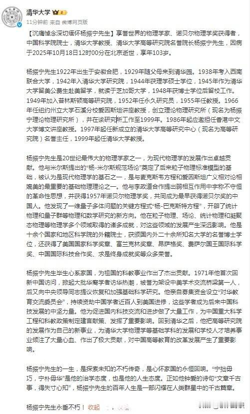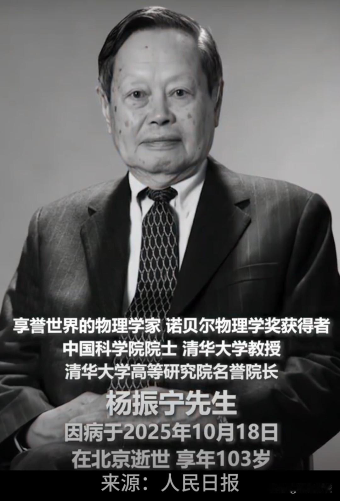默哀!!杨振宁的一生,绝对是后人很难企及的高度! 著名物理学家、诺贝尔物理学奖获得者,中国科学院院士,清华大学教授、清华大学高等研究院名誉院长杨振宁先生,因病于2025年10月18日在北京逝世,享年103岁! 央视新闻发文称,“宁拙毋巧,宁朴毋华”是杨老一生最喜欢的格言。这八个字,是他的治学态度,也是他的人生态度! 清华大学也发文沉痛悼念深切缅怀杨振宁先生! 如此辉煌的一生值得我辈为之努力!