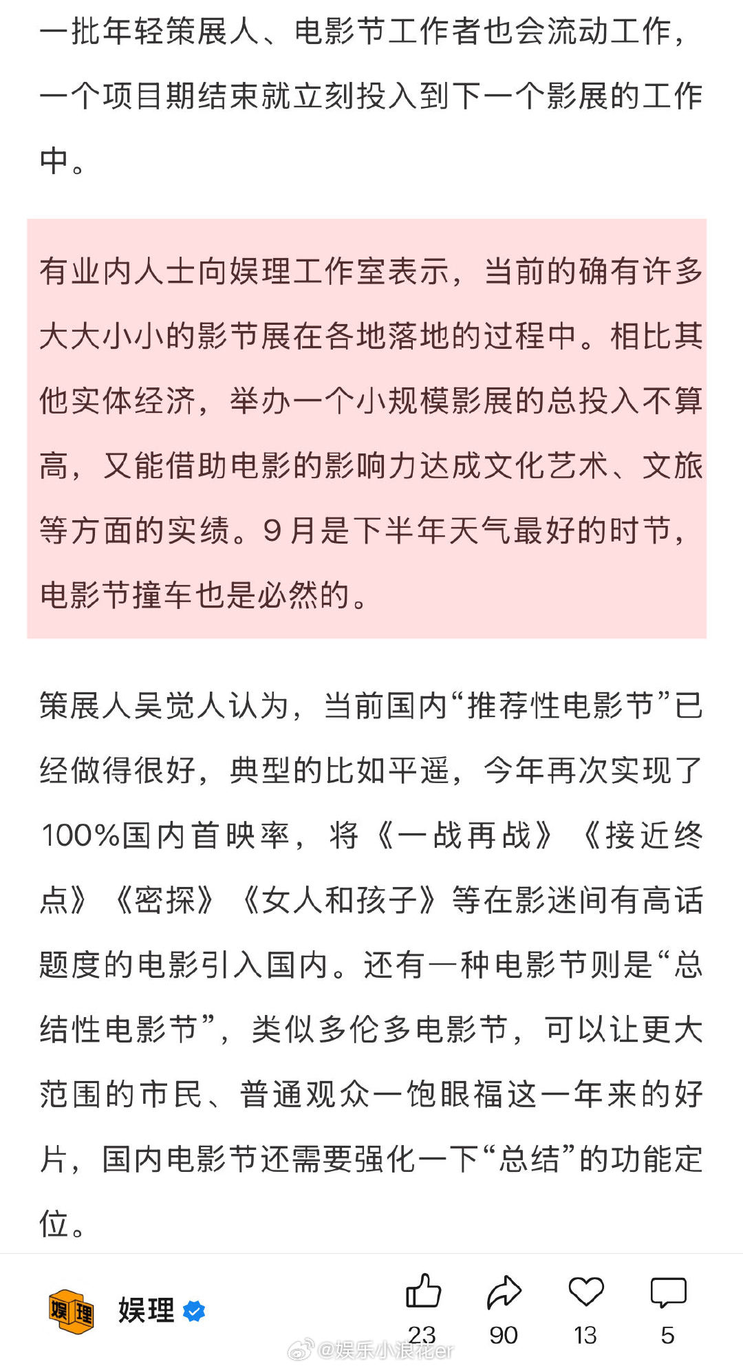 缺钱仍是电影行业最现实的困境 电影节能助力电影宣发吗 有业内人士向表示,当前的确有许多大大小小的影节展在各地落地的过程中。相比其他实体经济,举办一个小规模影展的总投入不算高,又能借助电影的影响力达成文化艺术、文旅等方面的实绩。9月是下半年天气最好的时节,电影节撞车也是必然的。娱理独家↓