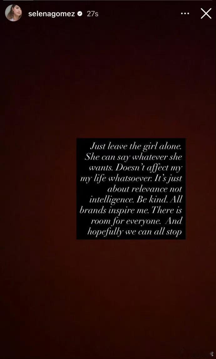 赛琳娜回应海莉海莉Hailey Bieber被问及赛琳娜Selena Gomez,她说自己不喜欢被拿来和任何人比较:“我不会对那些无法给我启发的人产生竞争感。”赛琳娜回应:“别管她了,她想说什么就说什么吧”,“友善一点,希望我们都能停下来。”