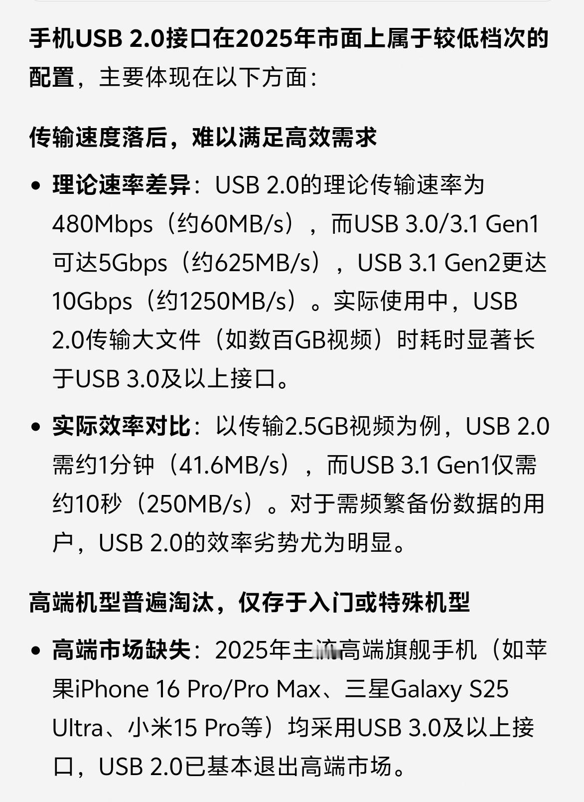 USB 2.0其实也还好,只不过就是慢。以传输2.5GB视频为例,USB 2.0需约1分钟(41.6MB/s),而USB 3.1 Gen1仅需约10秒(250MB/s)。对于需频繁备份数据的用户,USB 2.0的确是不咋滴!