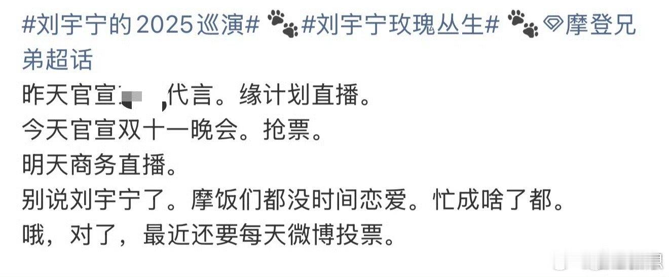 可把刘宇宁粉丝忙坏了 提名摩饭为“忙碌天花板”!刘宇宁活动、作品不断,粉丝既要支持线上,又要解锁番茄台晚会应援,痛车、大屏全打卡,忙到脚不沾地。